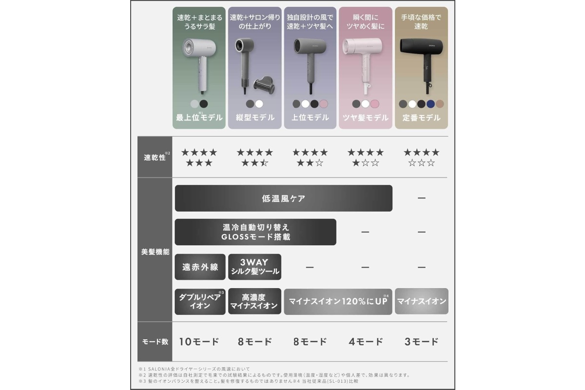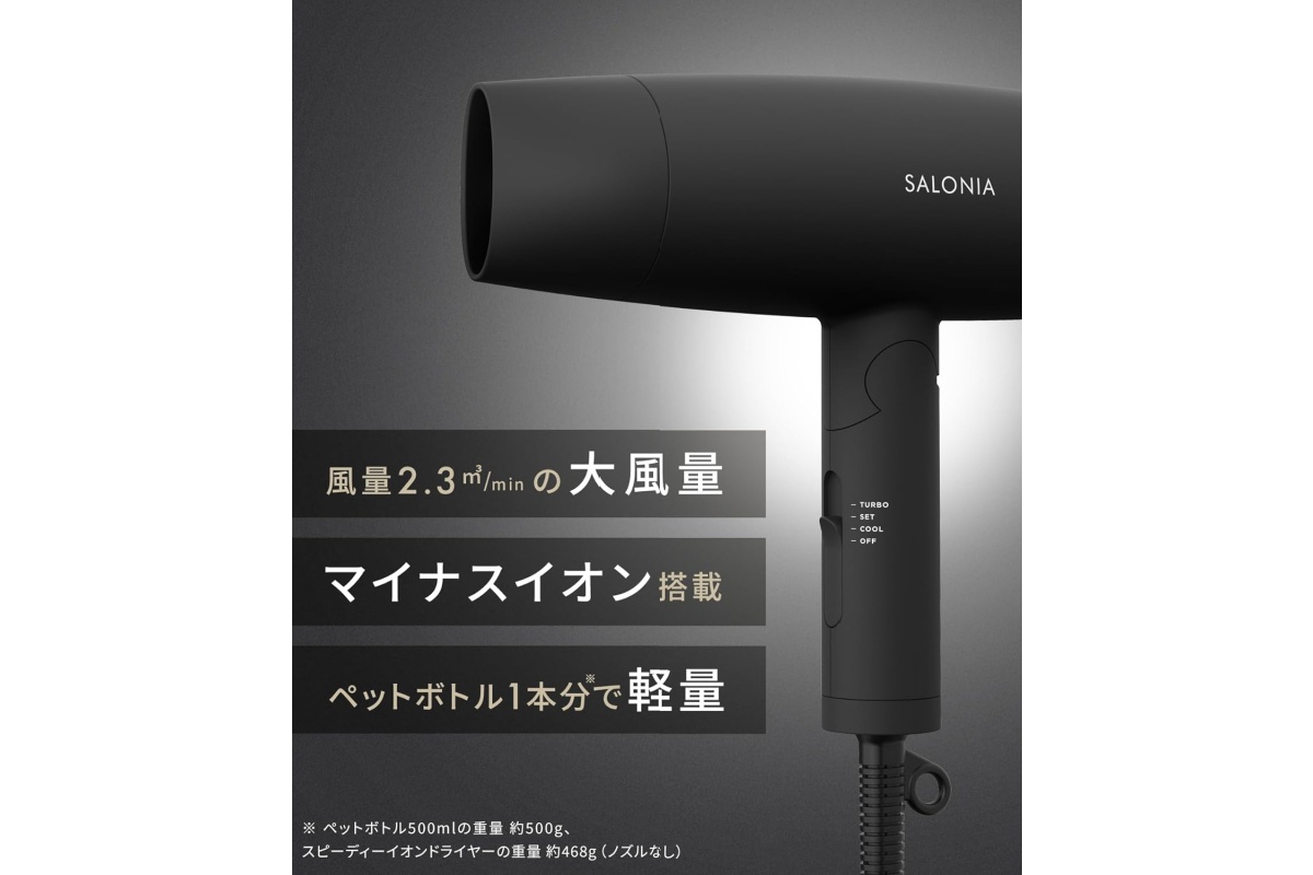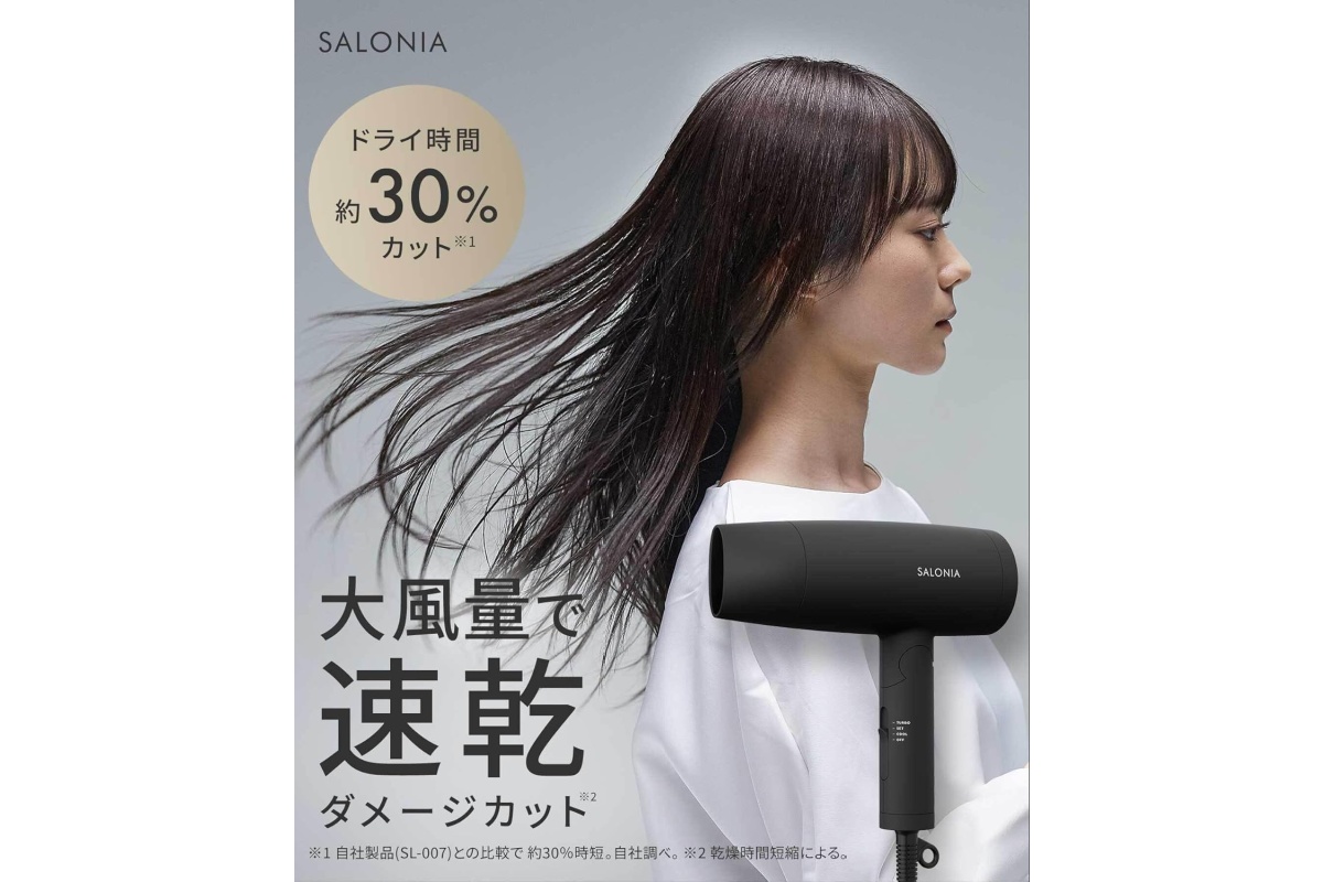 SALONIAのスピーディーイオンドライヤー(SL-013AB)は、毎日のドライ時間を短くしたい人に向いた定番タイプです。
