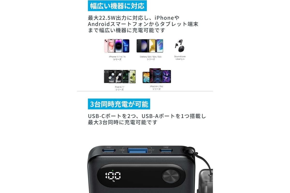USB-Cに対応しており、PDとPowerIQを搭載しているので、iPhoneやAndroid、iPadなど幅広い機器の充電に使えます。