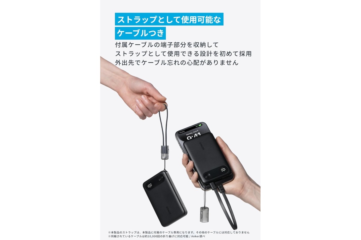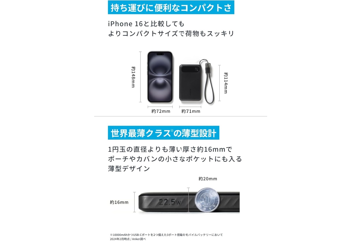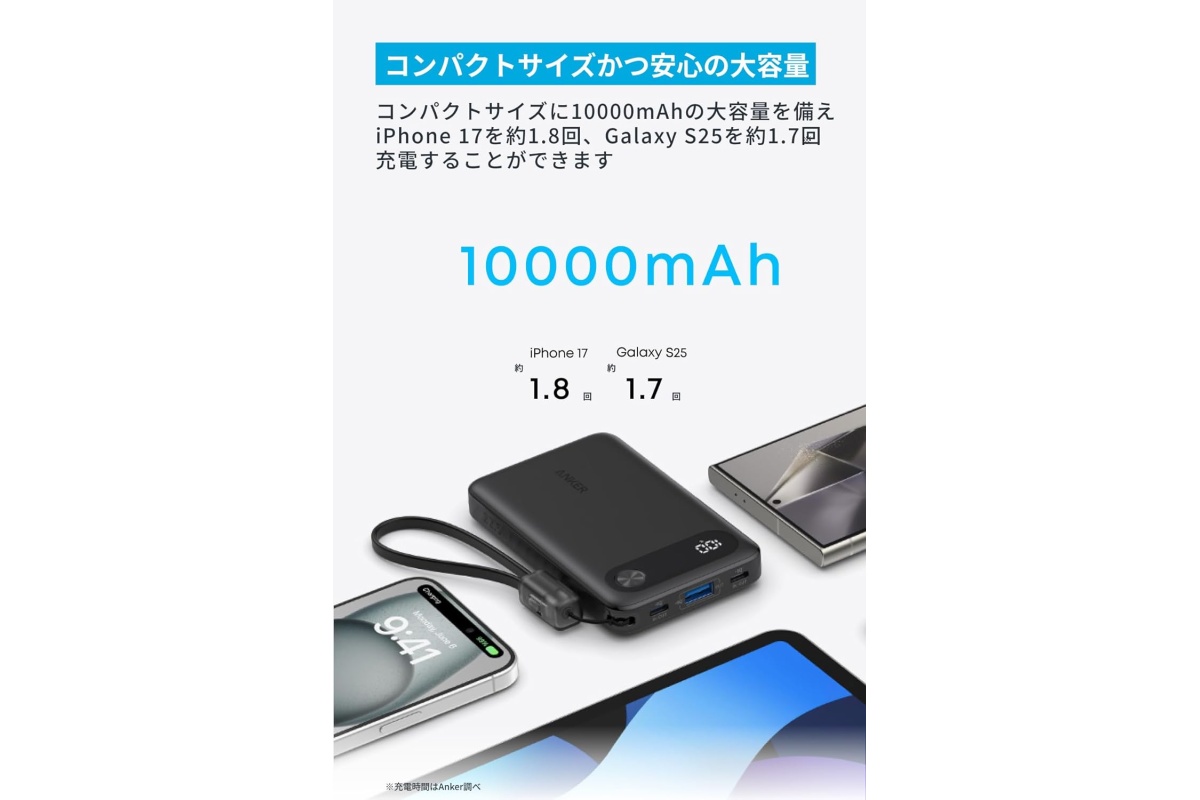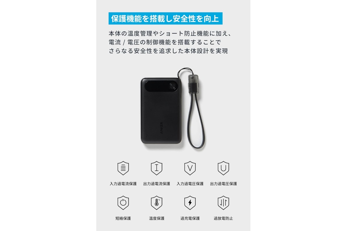 Ankerの容量10000mAhモバイルバッテリーは、最大22.5W出力に対応したスリムなモデルです。