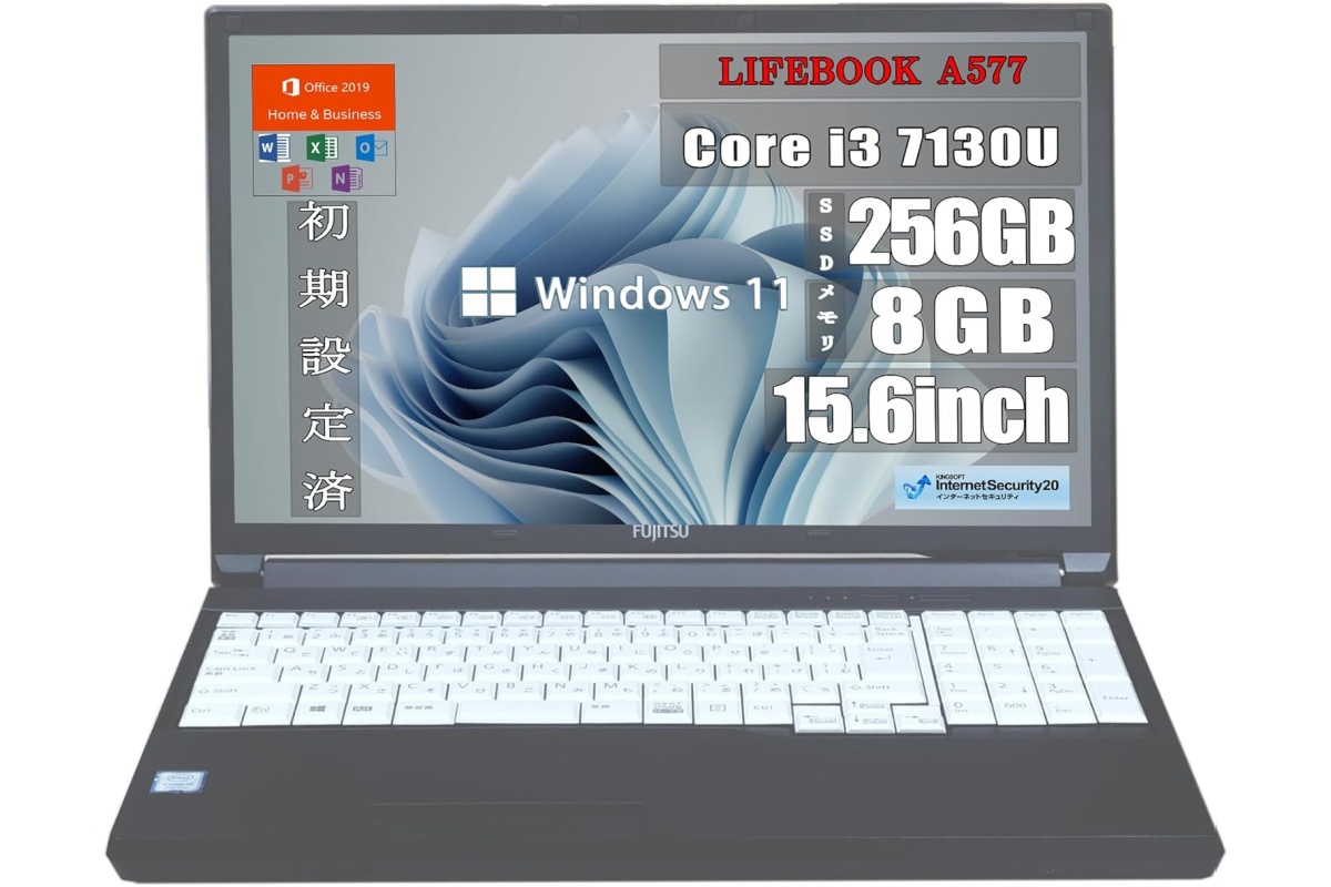 整備済み品の富士通 LIFEBOOK A577は、15.6インチの見やすい画面とテンキー付きキーボードで、書類作成や家計管理などの作業を広めの画面で行いたい方に向いたノートパソコンです。