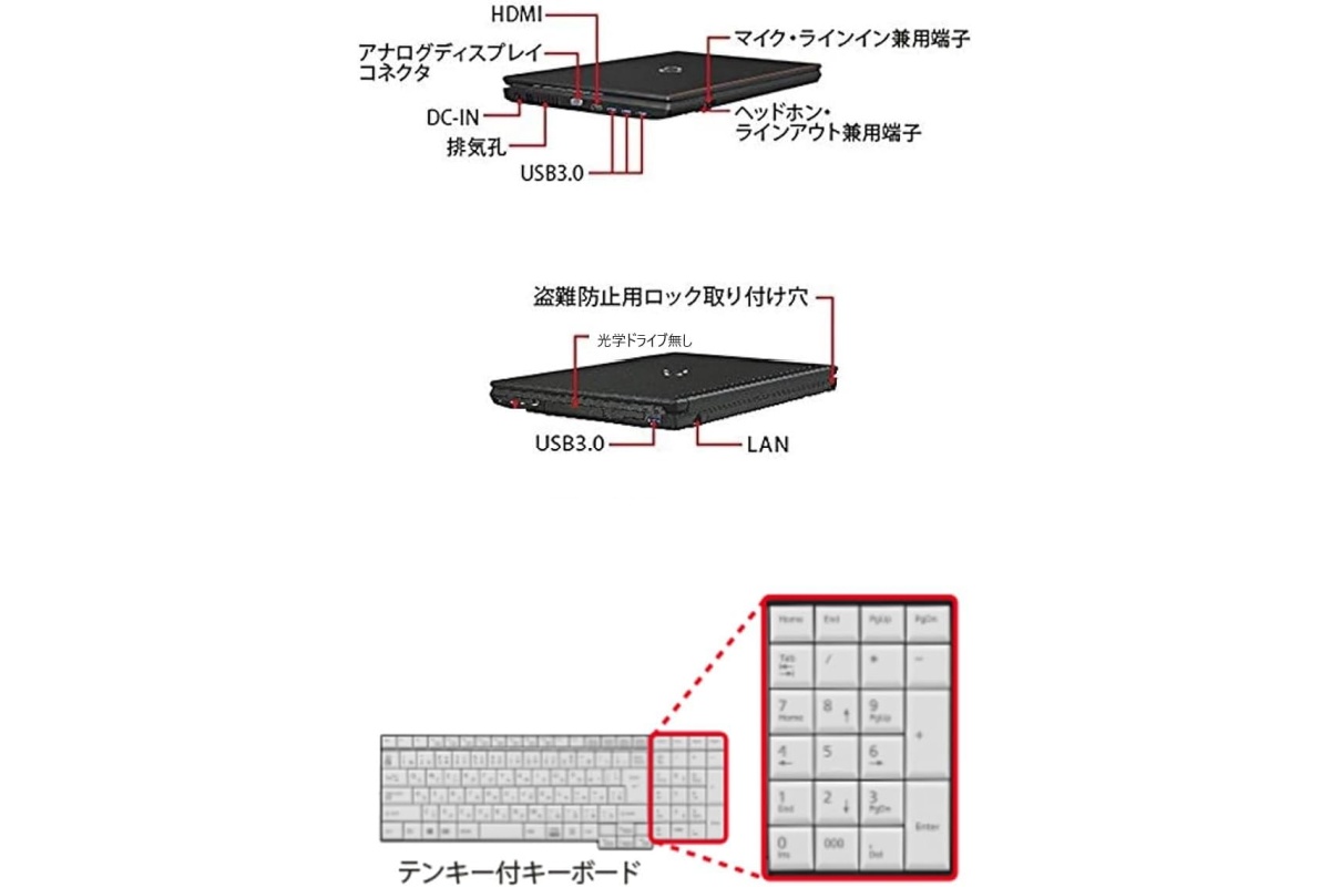 テンキーがあるので数字入力が多い方は作業効率を上げやすく、事務用途のサブ機としても扱いやすいです。