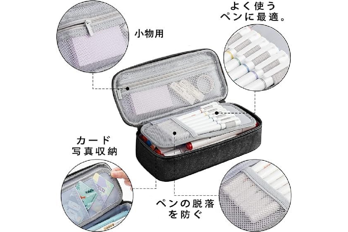 内側はペンホルダーやポケットで仕分けしやすい構成で、ペン・定規・消しゴム・付せんなどを「入れる場所」を作りやすいのがポイントです。