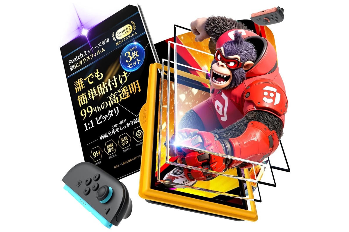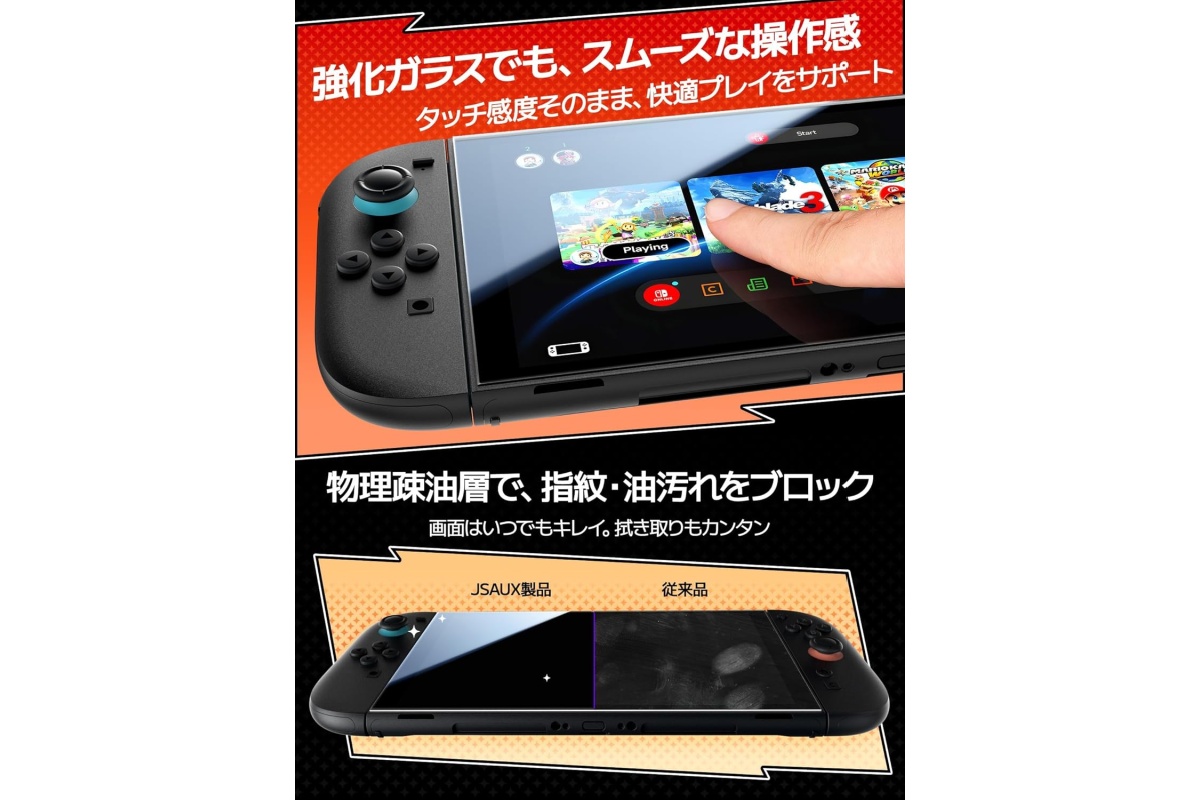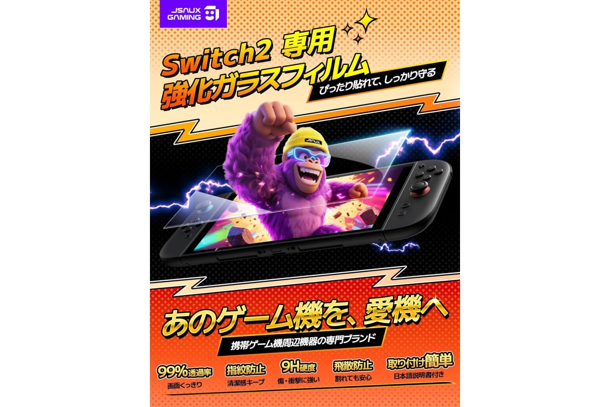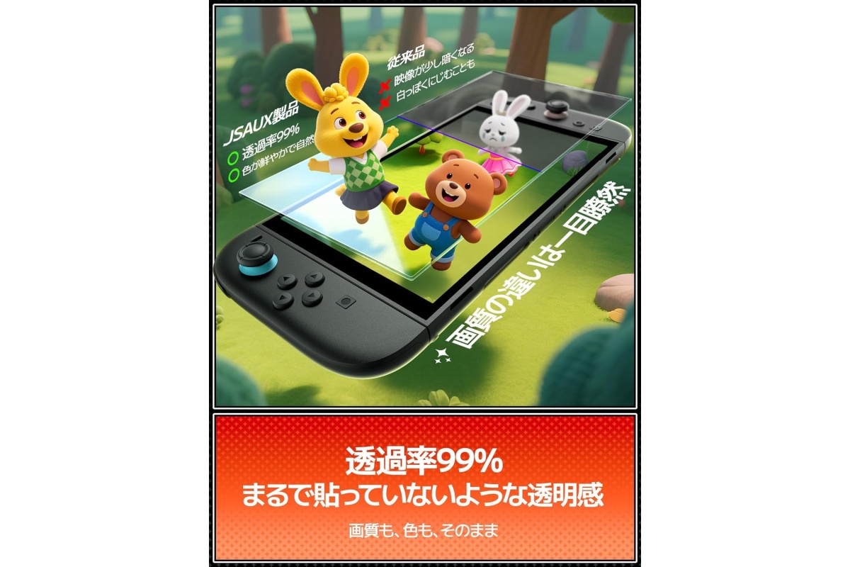 JSAUXのSwitch 2/スイッチ2用保護フィルムは、画面をしっかり守りつつ、見た目や操作感を損ねにくいガラスフィルムです。