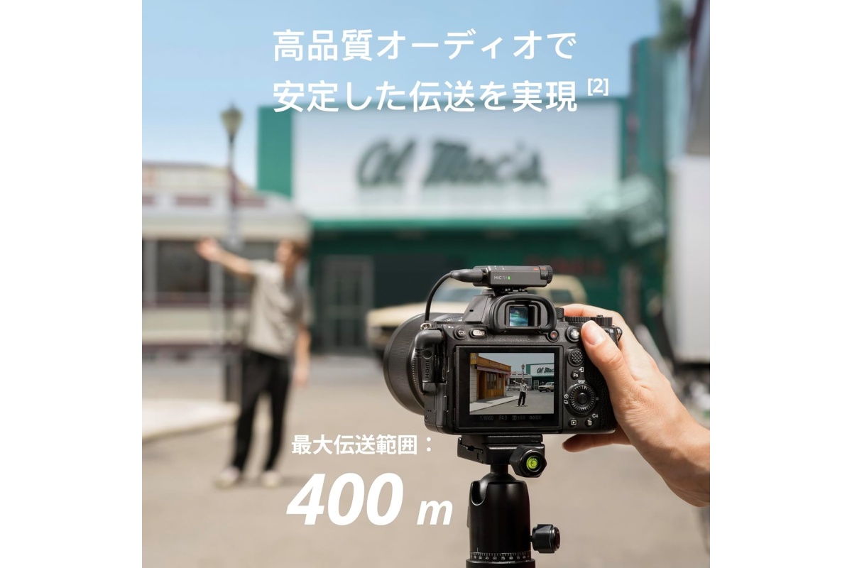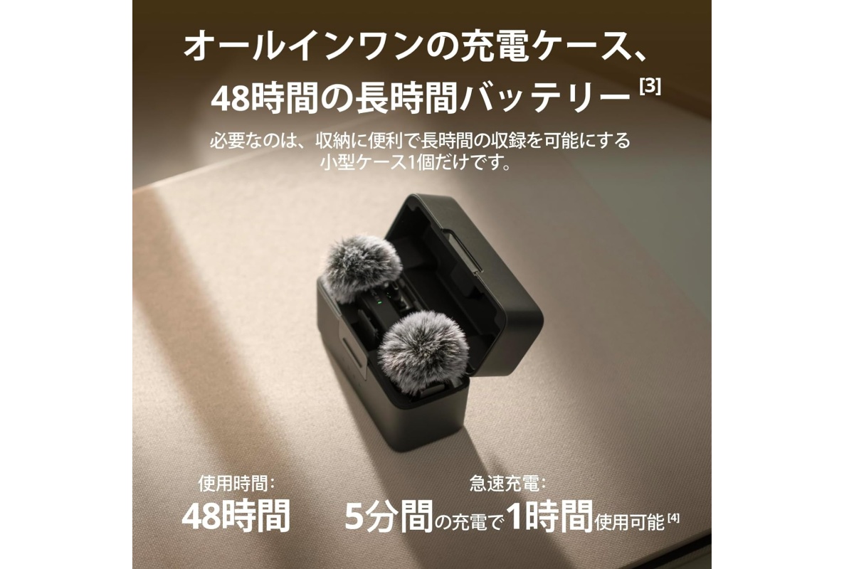 手のひらに収まるコンパクトなサイズながら、安定した音声伝送とノイズキャンセリング機能を備えており、屋外撮影や人の多い場所でも声をクリアに拾ってくれます。