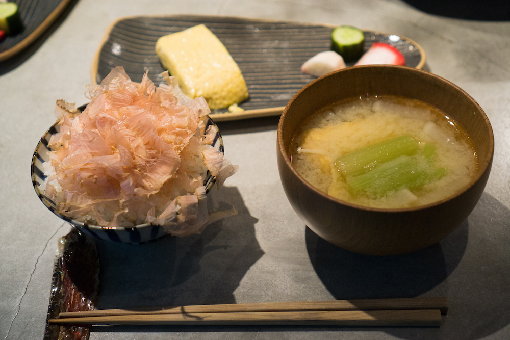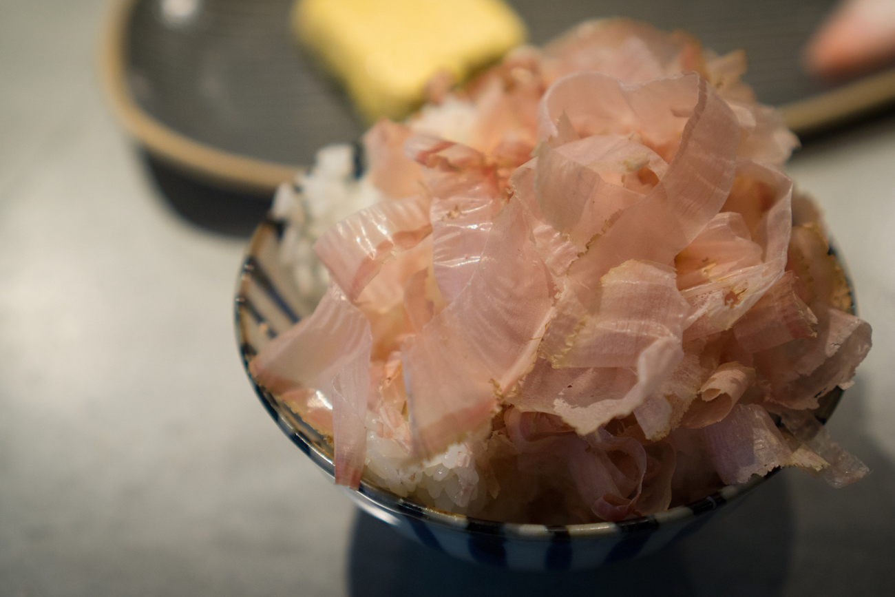 Freshly shaved, beautiful pink bonito flakes joyfully dance on top of the hot rice; a soft sweetness and scent spreads in your mouth as you eat it. The relaxing miso soup has seasonal vegetables and big pieces of fried tofu, and the fluffy rolled omelet with a hint of cane sugar has a soft sweetness.