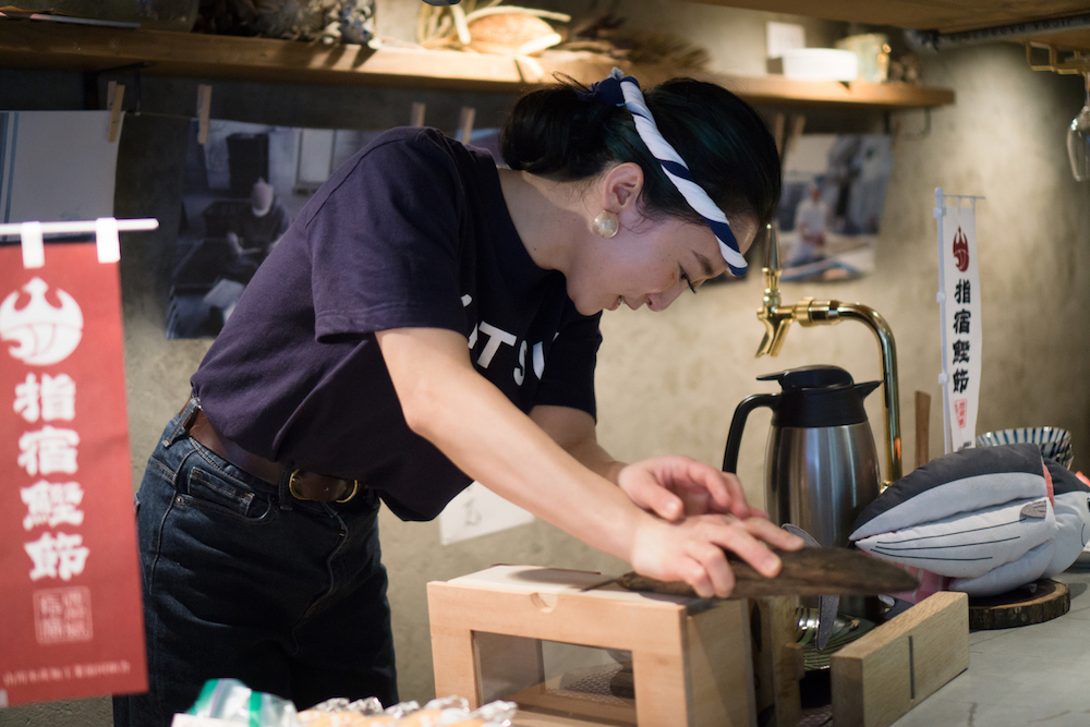 Finding some spare time between work, she searched “the oldest bonito flake” and Tago of Nishiizu, Shizuoka came up. It was then, when her “club-style miniskirt-and-10cm high-heel fashion,” journey became serious. Later on, she traveled all across Japan, from Kesenuma in the North to Miyakojima in the South. Through interaction with the people in each area, she was able to understand their story and history first -hand, so, she came to think “I want to gather bonito flakes from various regions and make something together”. From this enthusiastic idea, she opened Katsuo-sha in November 24, 2015 as a missionary of bonito flakes.
