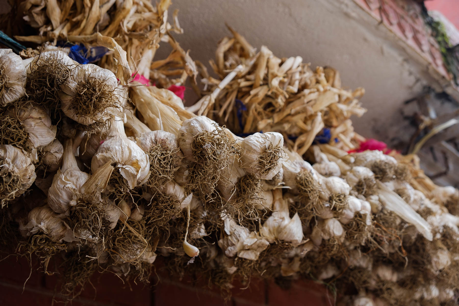 そんな村に住む、サインジェさんのお宅に伺った。ローカルな食事を作ってくれるという。到着すると明るく広いキッチンで腕を振るっていた。屋上にはハーブやスパイスが栽培されていて、大量のニンニクが軒下に吊るされている。