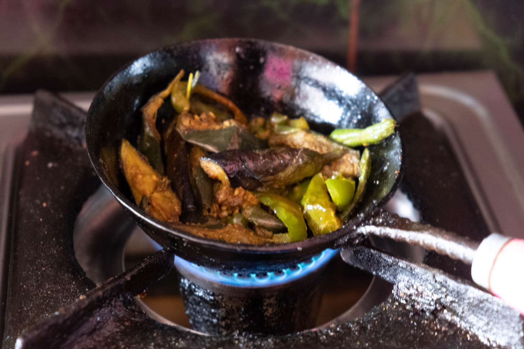 フライパンで作ってくれていたのは、様々な野菜を使った数種のカレー。「タルカリ」という。カレーと言ってもインドのものや日本のものとも異なり、生の唐辛子、ターメリック、クミンといった香辛料を使って野菜を炒めたもの。確かに辛く、いわゆるカレーの香りがするが、煮込まないのでフレッシュな食感に仕上がっている。ゴーヤ、茄子、オクラ、えだまめ、さやえんどう、しし唐、じゃがいも、カボチャなどを組み合わせて、少しずつ違った味わいに仕上げてくれた。