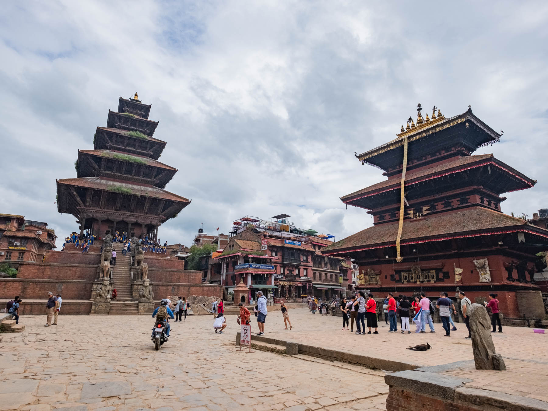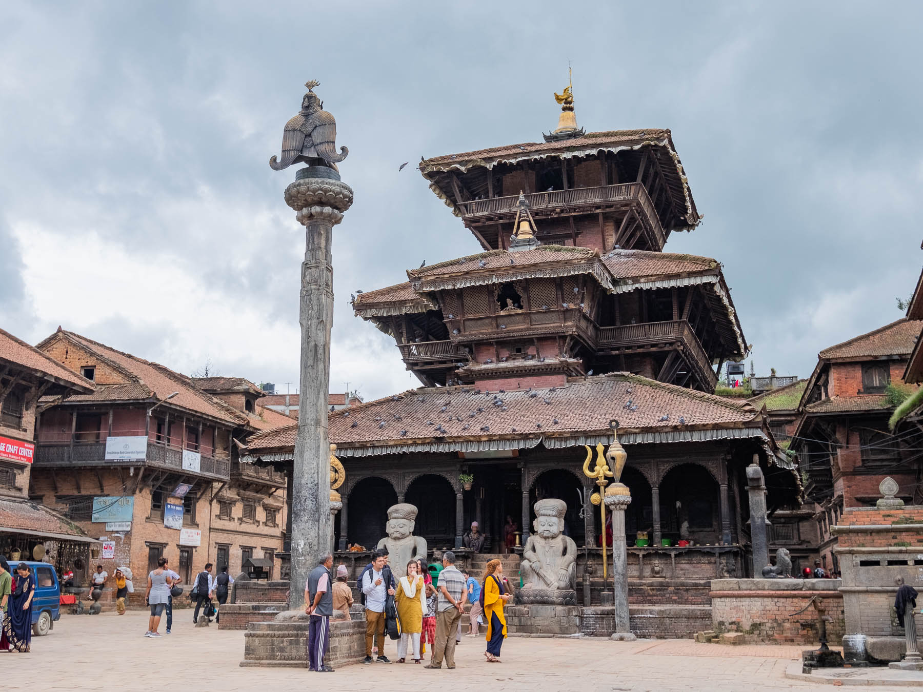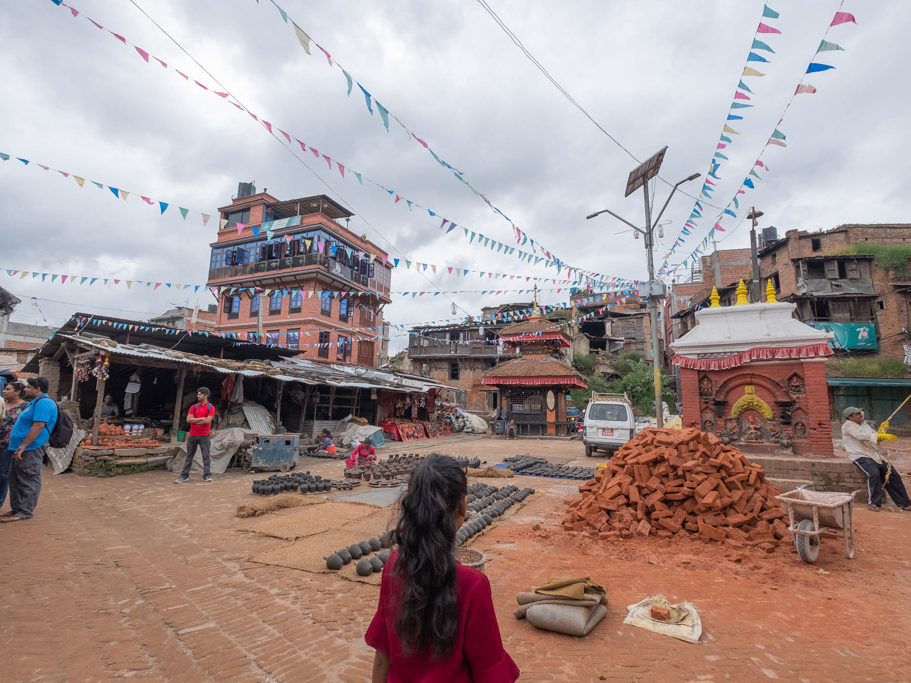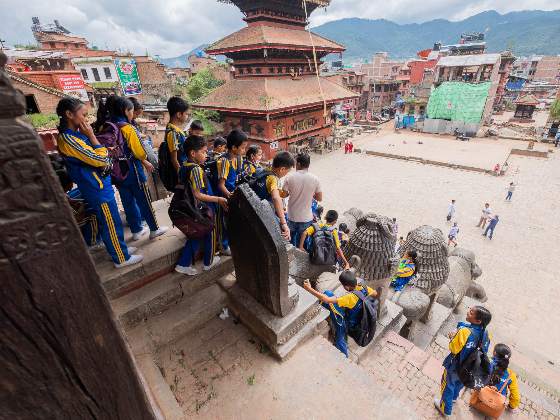 バクタプールの王宮広場にはレンガが美しく敷き詰められ、歴史を感じさせる王宮やヒンズー教寺院の建物が取り囲んでいる。すぐそばにはナタボラ寺院の五重塔がそびえる。この日は地元の小学生たちが遠足で来ていた。バクタプールも2015年の大地震の被害を免れなかったが、この五重塔には被害がなかったそうだ。