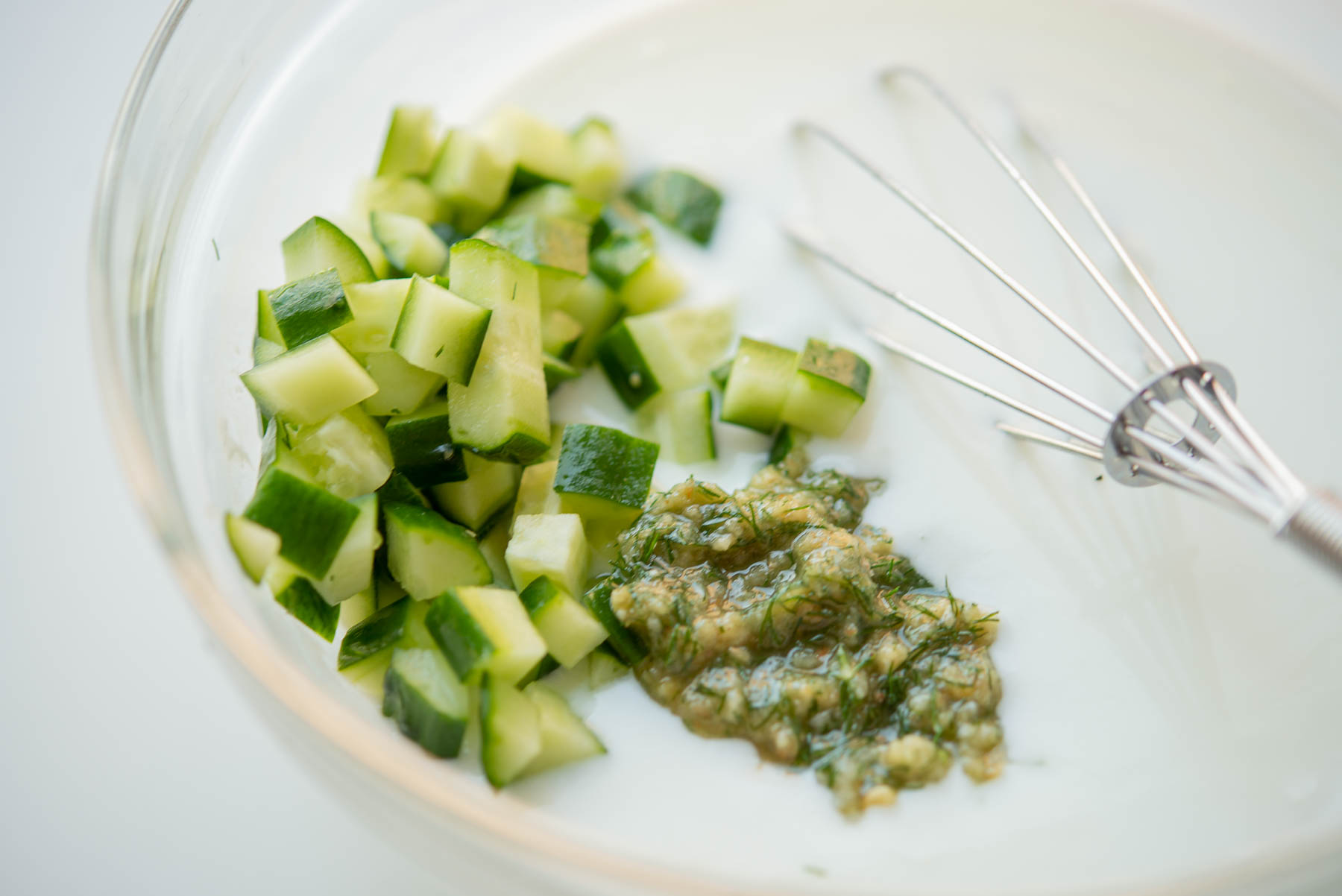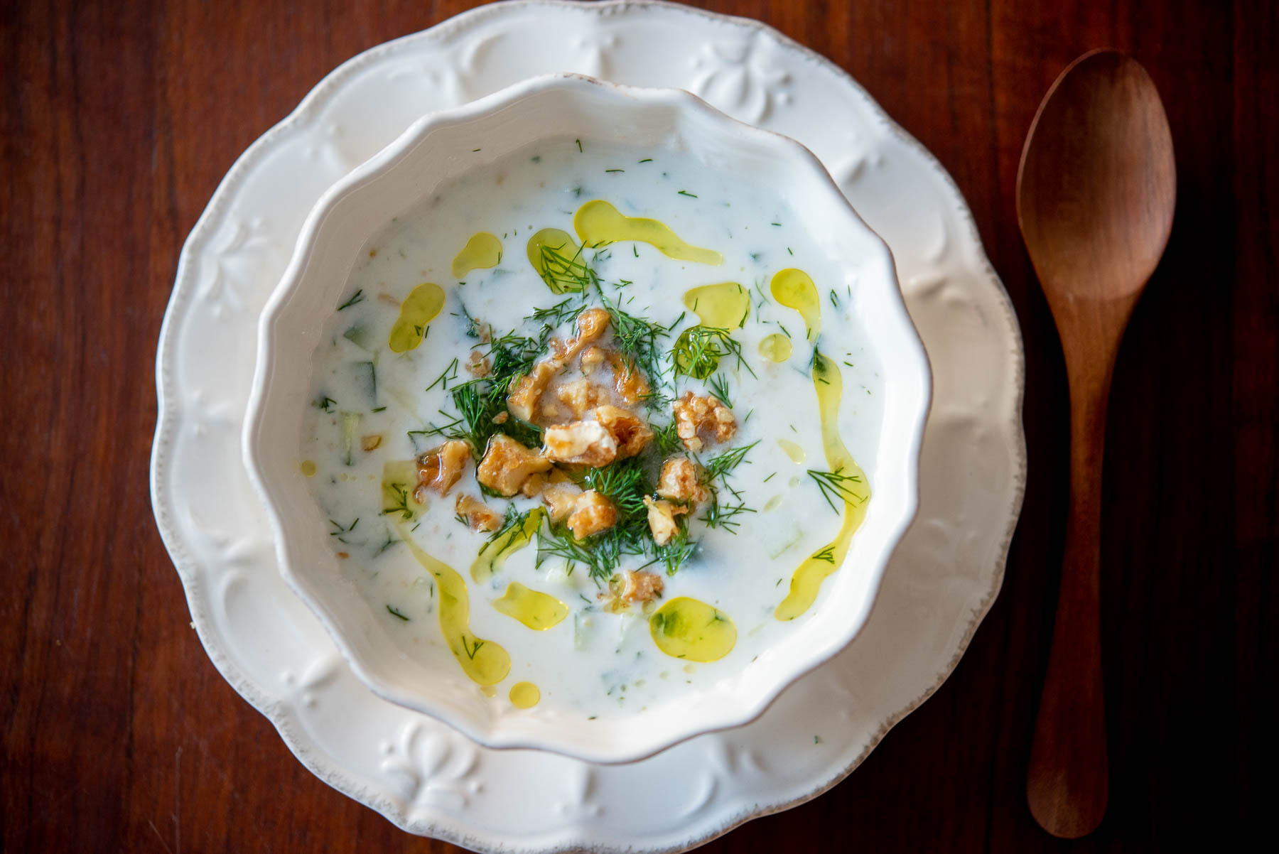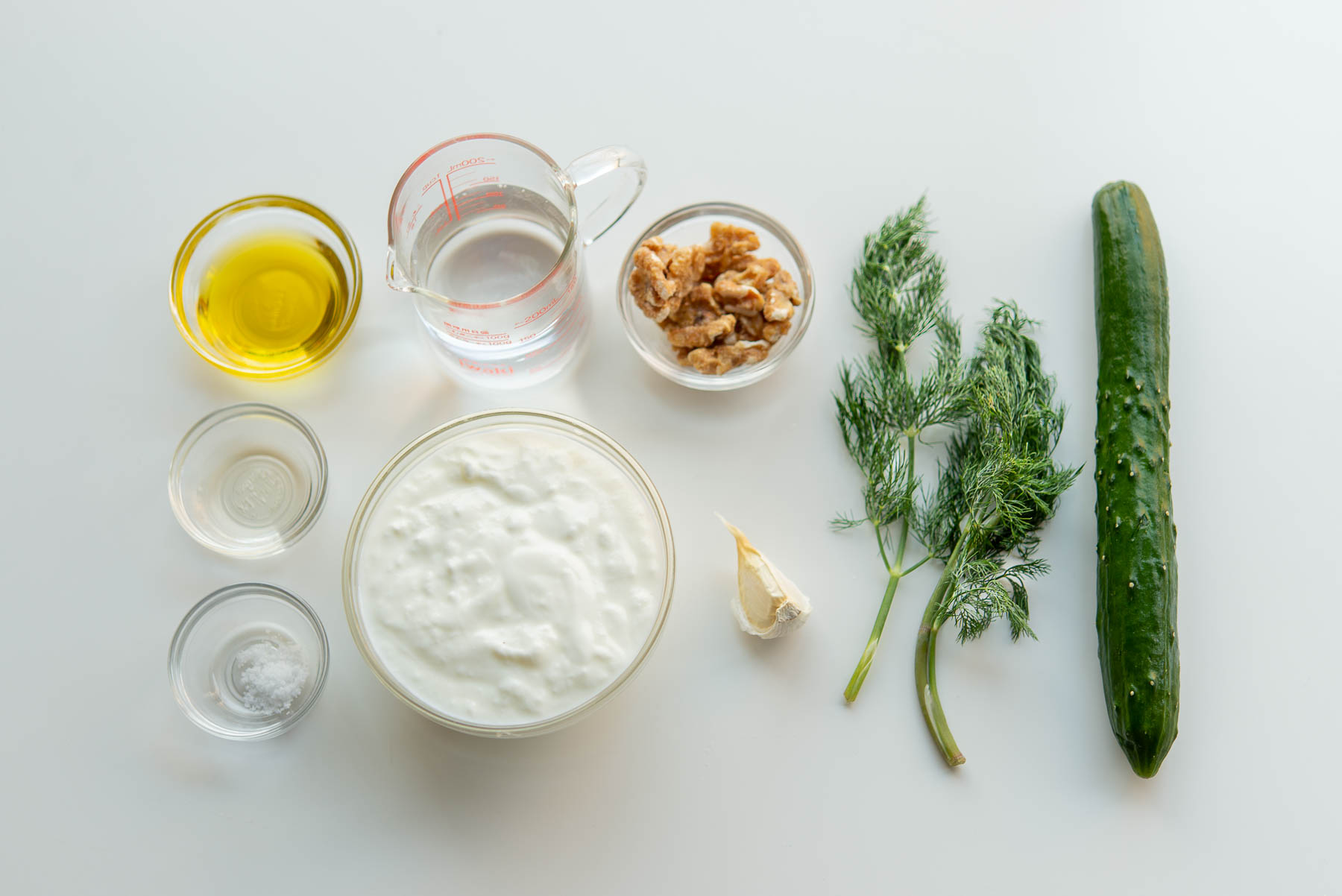 一切火を使わずに作る。くるみ、オリーブオイル、ディルの一部は取りおいて仕上げにも使う。作った後に冷蔵庫に冷やしておくのもおいしい。また、生のにんにくをおろして使うのだが、ヨーグルトとディルのおかげで食後に香りがほぼ残らないようだ。