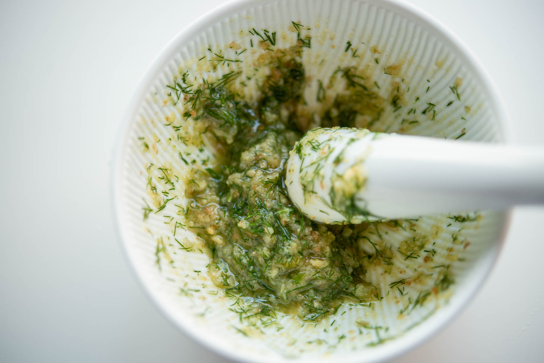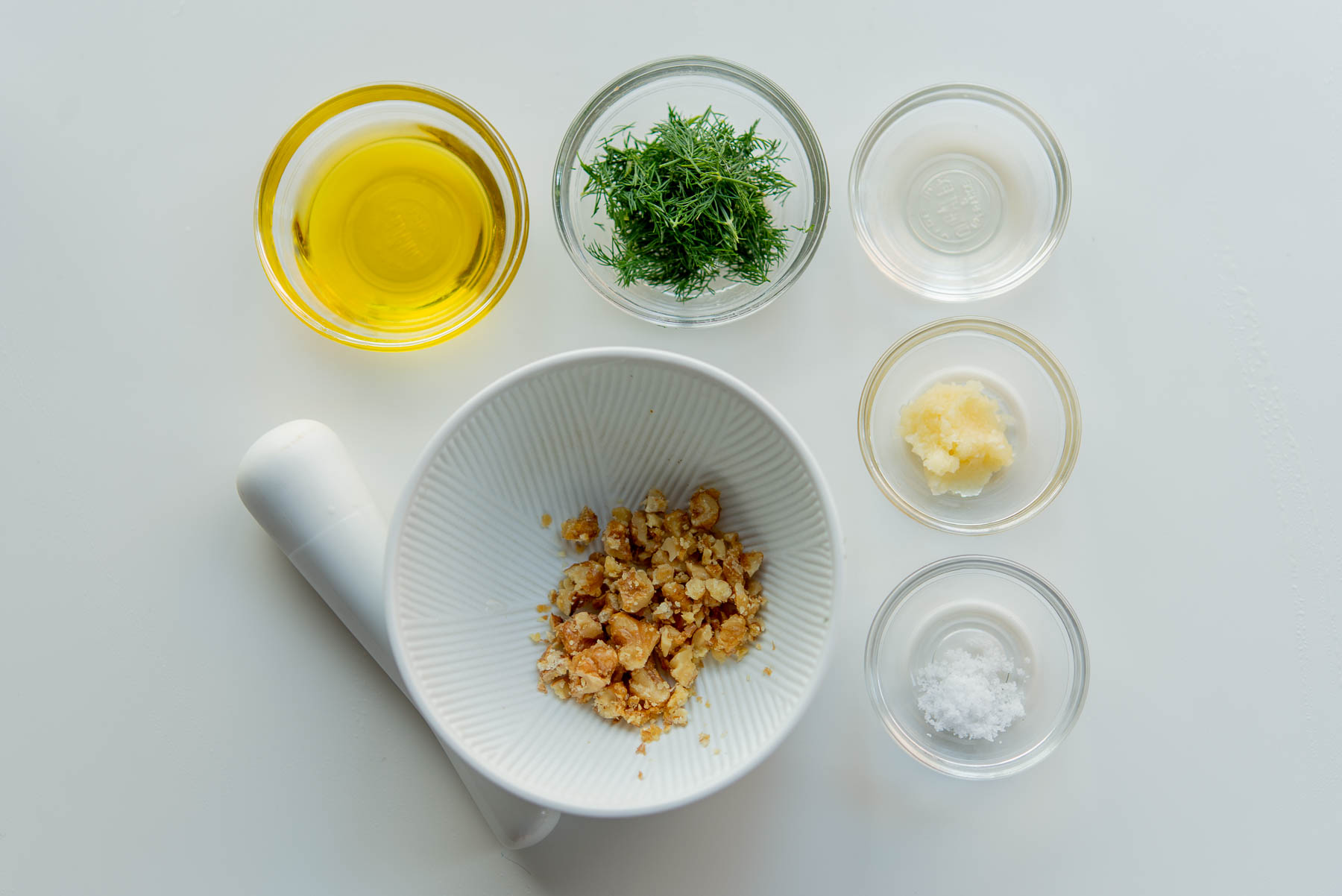 1.にんにくとくるみの大さじ1、塩とオリーブオイル大さじ1、ワインビネガー、ディル大さじ1をすり鉢に入れてペースト状にする。
