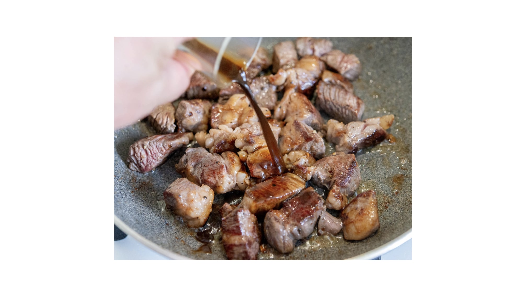 5. そのままフライパンを中火で温めたら牛肉を入れて、ミディアムレアに火を通す。ウスターソースを回しかけて1分ほど炒めて、蓋をして5分寝かせる。