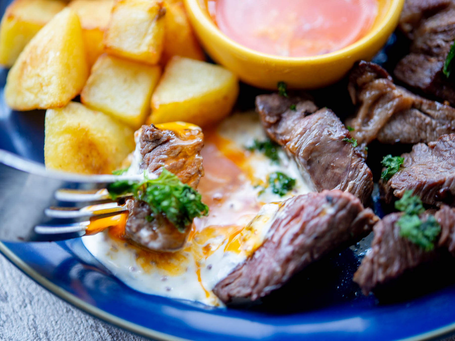 それぞれの材料を別々に調理するのは少し面倒だが、食べる時にはそれぞれのテクスチャーが感じられる。卵黄とマスタードソースが牛肉にもじゃがいもにも合う。玉ねぎも加えてまた別のソースになるのが面白い。