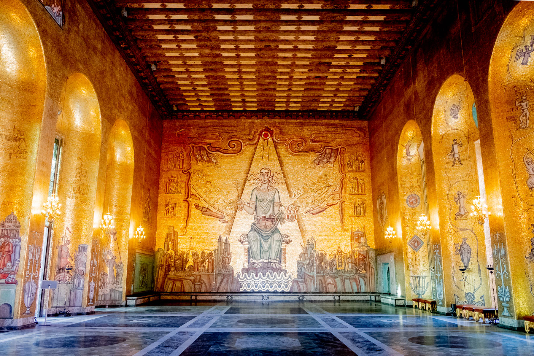 また、ノーベル賞の晩餐会が開催されることで有名なストックホルム市庁舎の中でも必見なのは黄金の間だ。金箔をはったモザイクが煌びやかで、奥の壁の中央にはスェーデンのメーラン湖の女王が描かれている。この部屋ではノーベル賞のティーパーティーが開催される。それにしても煌びやかだ。建築家ラグナル・エストべりが設計し完成したのが1923年というから、比較的新しい建造物といえる。(ちなみに、日本の金閣寺は1397年に建立された)