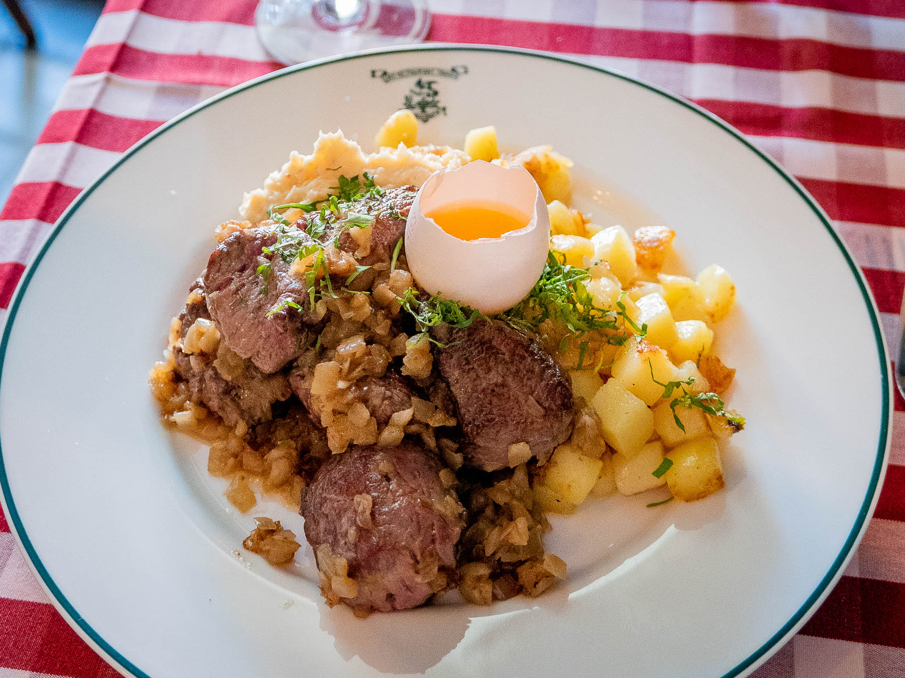 ウェイターに、この店で一番スウェーデンらしい食べ物は何かと聞いてみると、「ミートボールやアンチョビ入りのジャガイモ料理なら有名だしどこの店にもあるから、Biff Rydberg(ビフ・ライドバーグ)がいいんじゃないかな。牛肉のステーキみたいなものだけど」というので、迷わずオーダーしてみた。