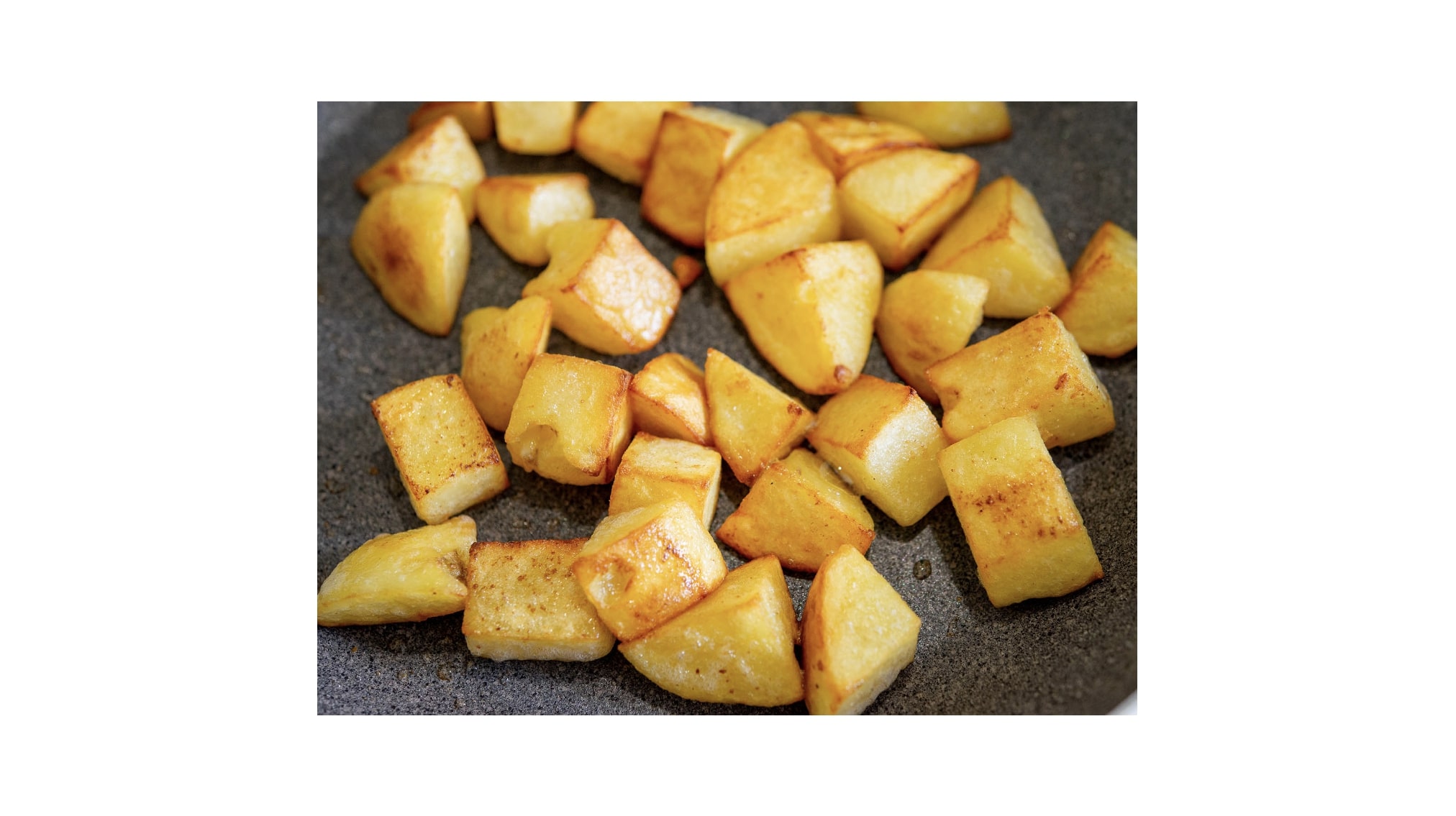 • ジャガイモはゆっくりと弱火から中火で火を入れ。バターの味をしっかりと含ませ、やわらかくなったら中火で表面にしっかりと焼き色を受ける。