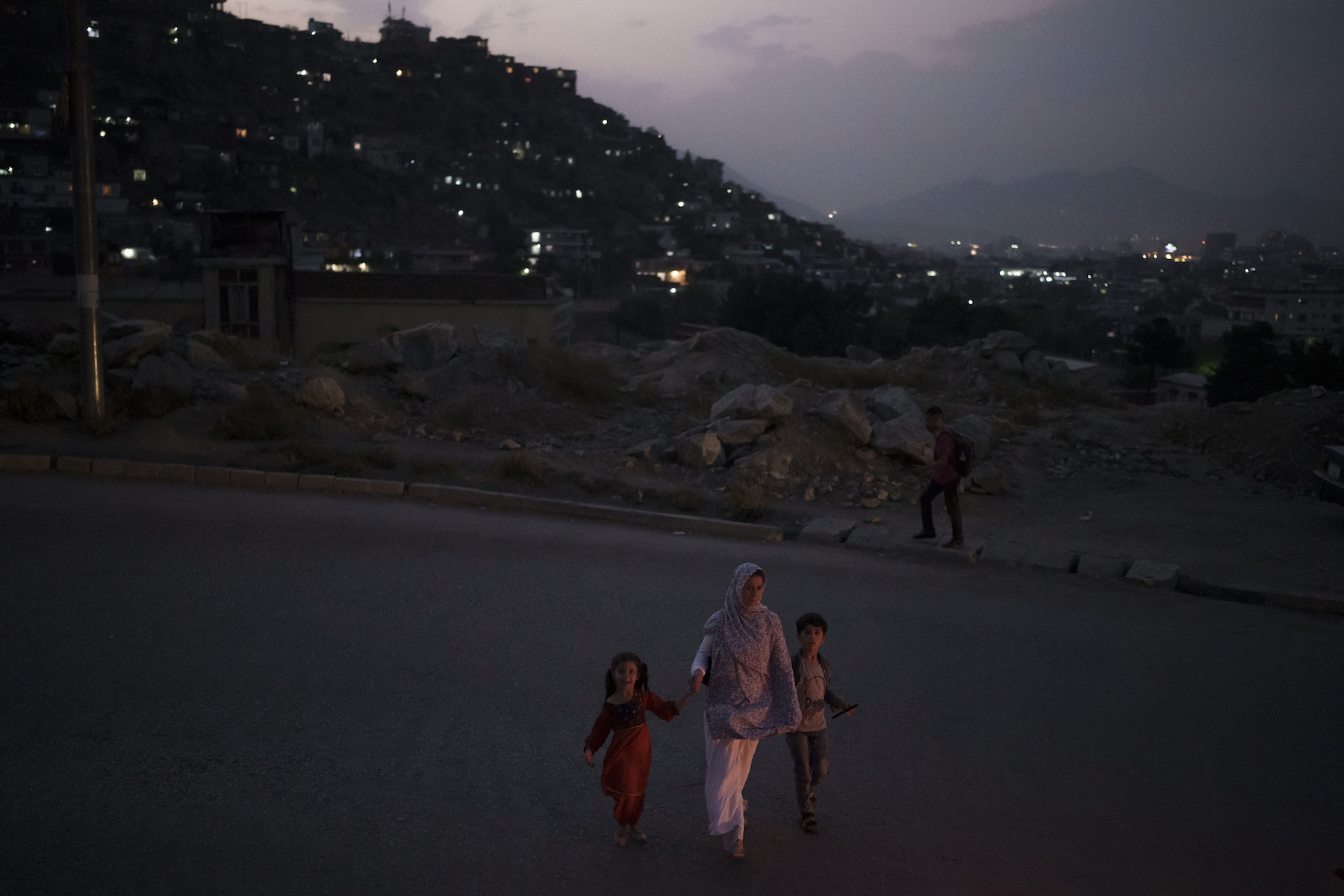 As night fell, a woman crossed the street holding the hands of a little girl and boy, the lights of Kabul dotting across the hills behind them.