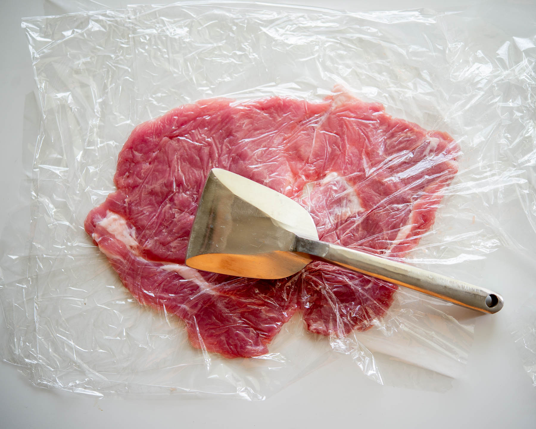 1. 豚ロース肉を肉たたきで4㎜の薄さまで伸ばす。