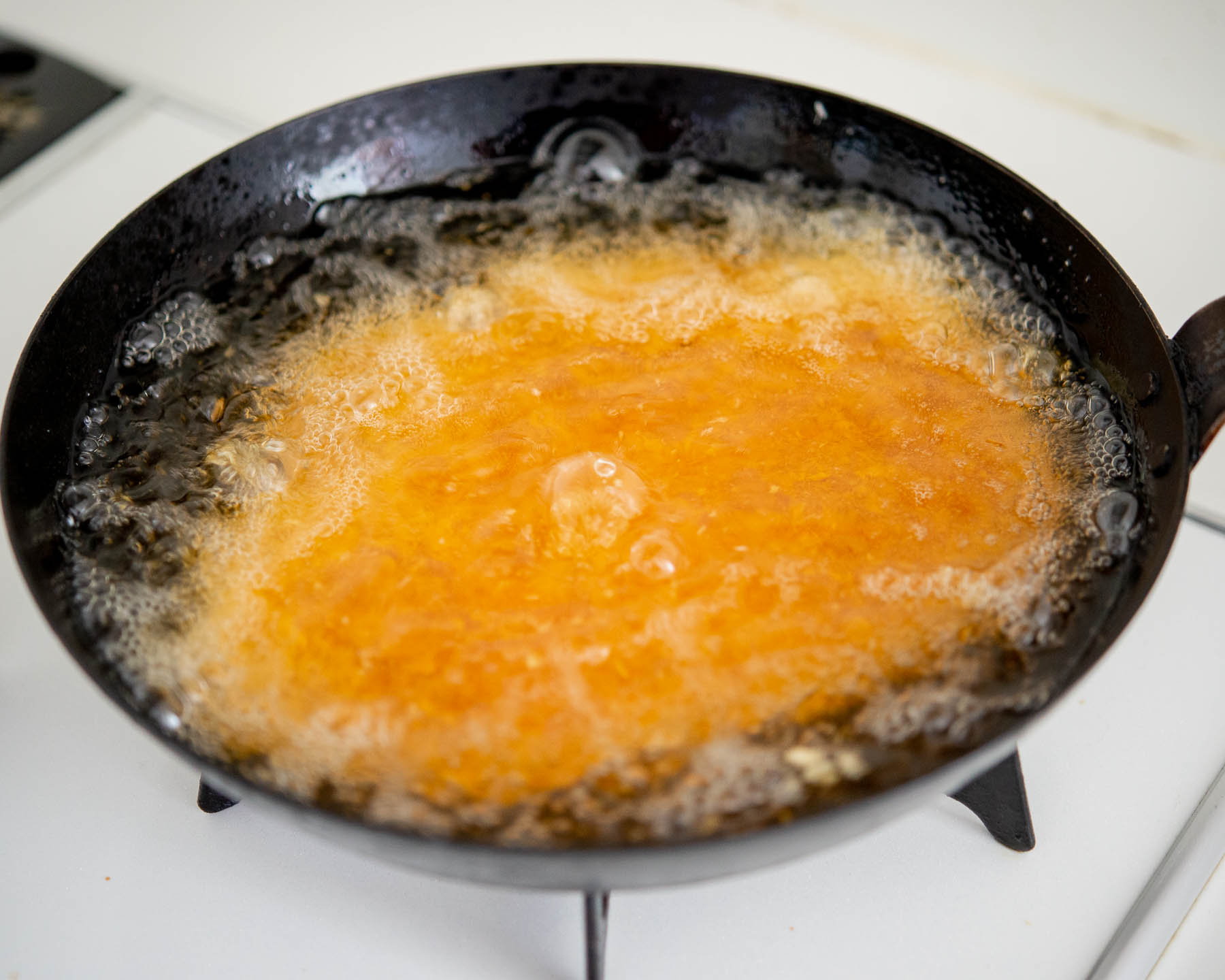 4. フライパンに植物油を入れて180度に熱し、3を入れて3分揚げて、ひっくり返してさらに2分程度、きつね色になるまで揚げる。