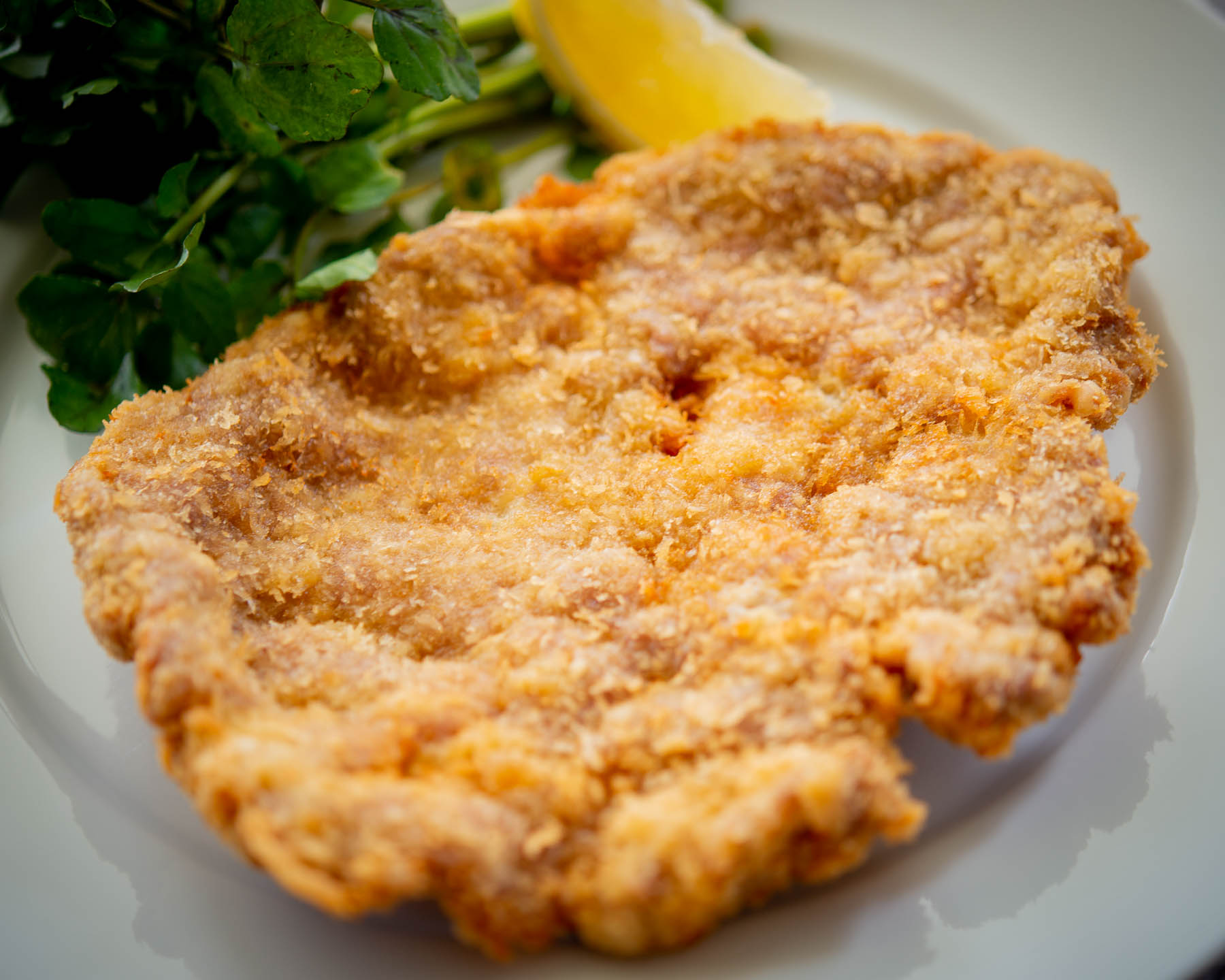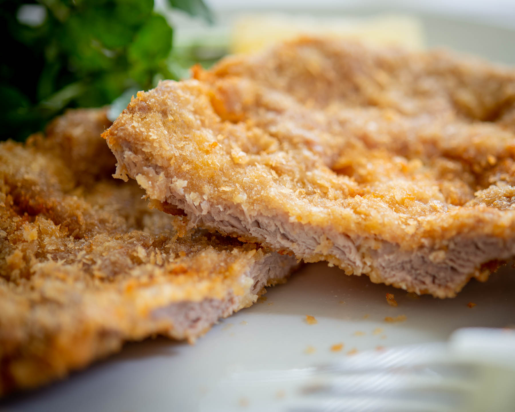 薄くのばした肉を「ウィンナー・シュニッツェル」たらしめるものは一体何かと言えば、それほど堅苦しい決まりはないようだ。薄くのばした肉に衣をつけて揚げた料理。肉は仔牛でも豚肉、鶏肉でもいい。