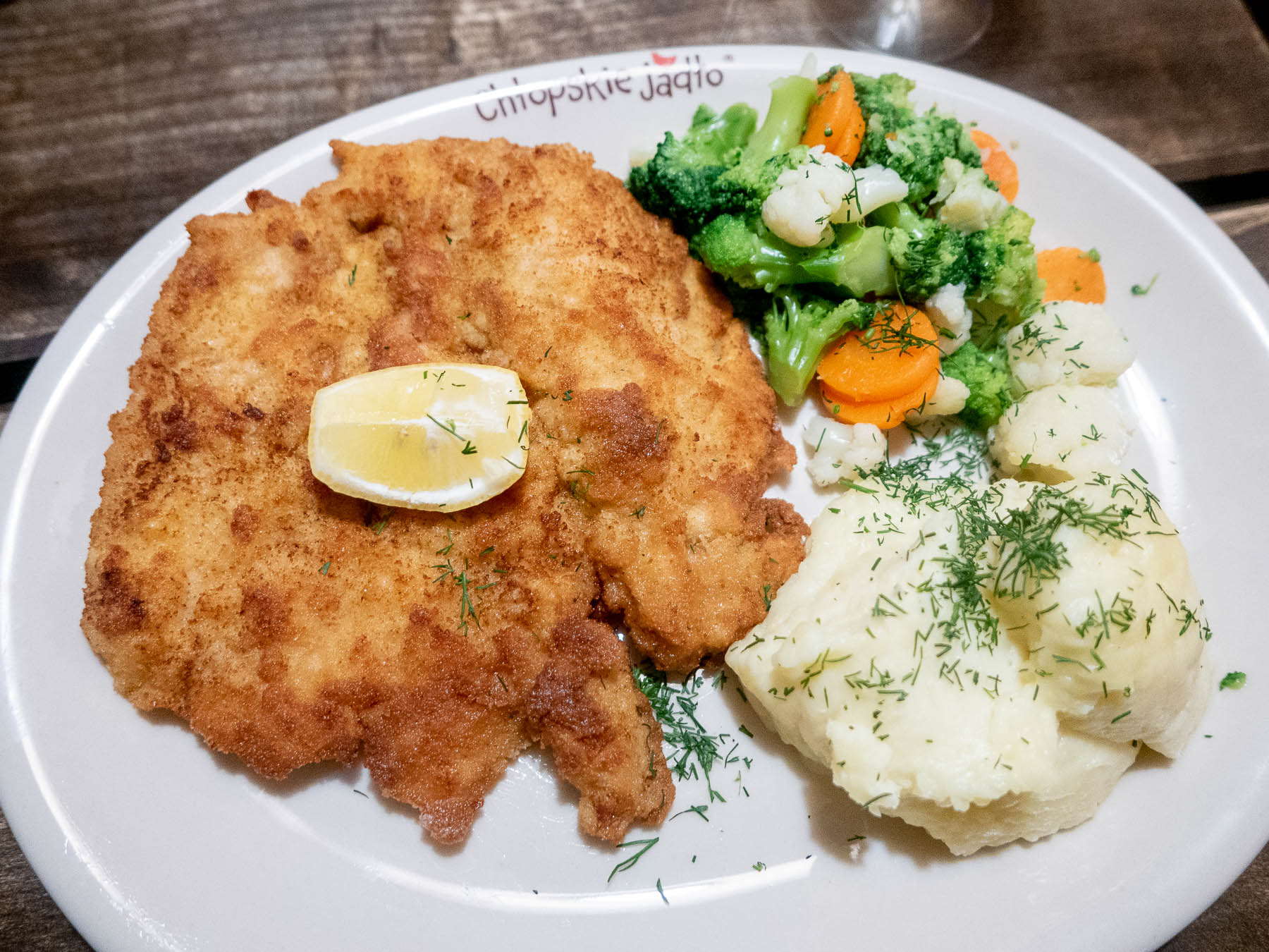 ポーランドのクラコフで入ったポーランド料理店「Chopskie Jadlo」にもシュニッツェルがあった。名前は「コトレット・スハボヴィ」というから、「ロース肉のカツレツ」だ。肉はやはり薄くのばされている。