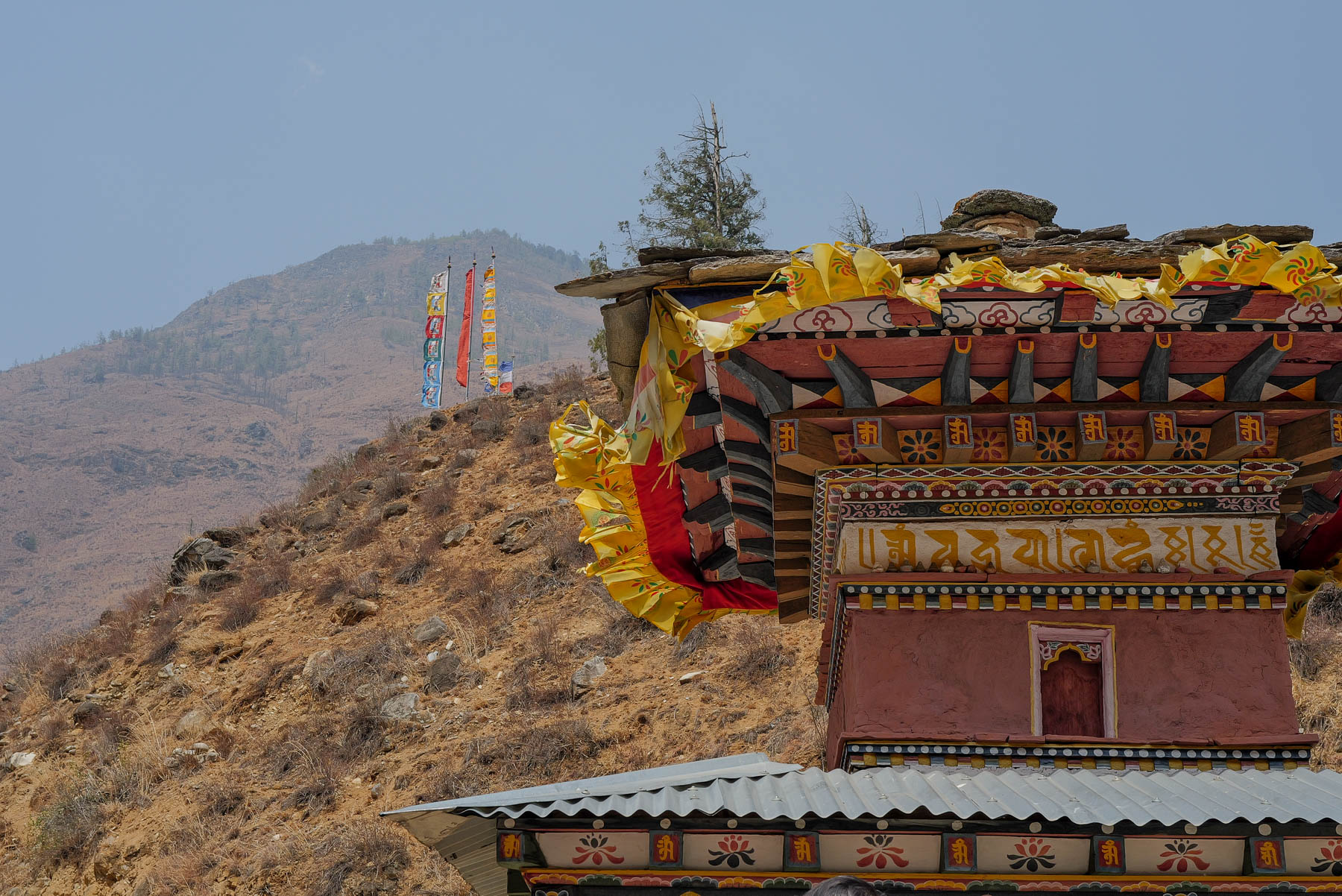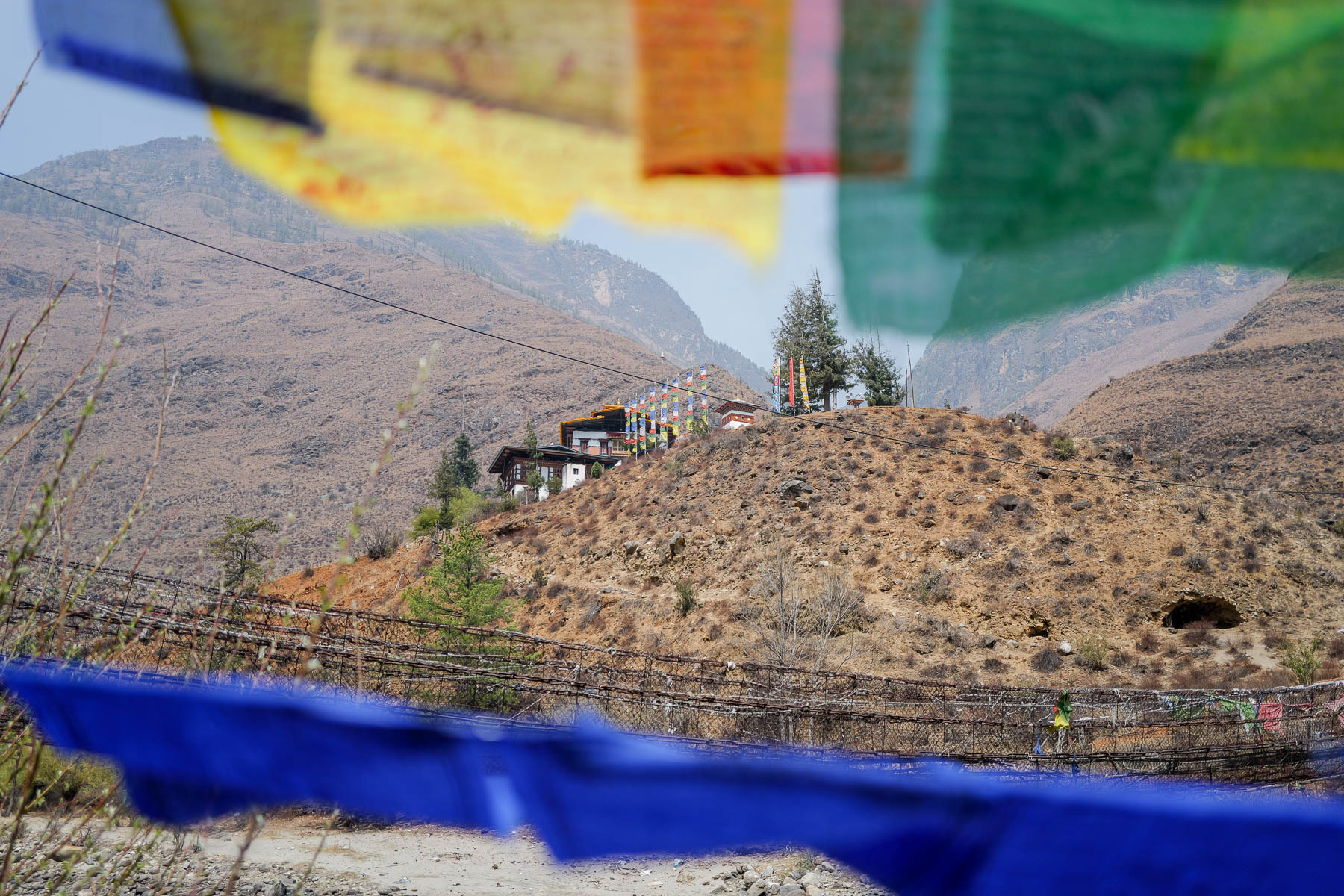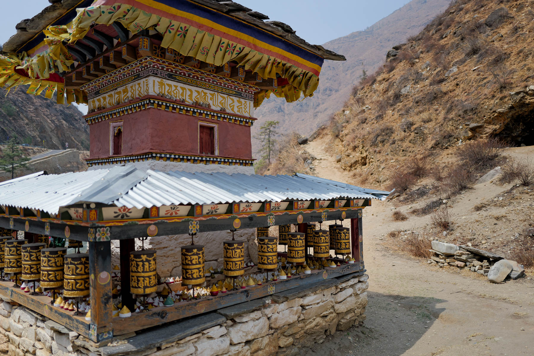 パロ空港から首都ティンプーまでは、車で1時間ほど。その道のりの半ば、パロ川を挟んだ山の中腹にタチョラカンという寺院が姿を現す。川にかかる橋には青・白・赤・緑・黄の五色の小さな旗――経文が書かれた「ルンタ」が風にはためいている。青は天、白は風、赤は火、緑は水、そしては黄色は地を示している。寺院のそばの仏塔には祈りを込めて回すためのマニ車が並んでいた。