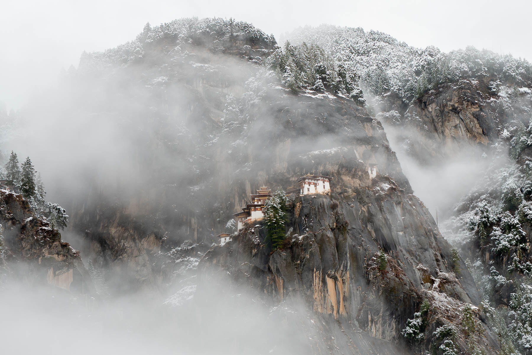 この写真は、季節外れに雪化粧をまとった絶壁の寺院、タクツァン僧院だ。
