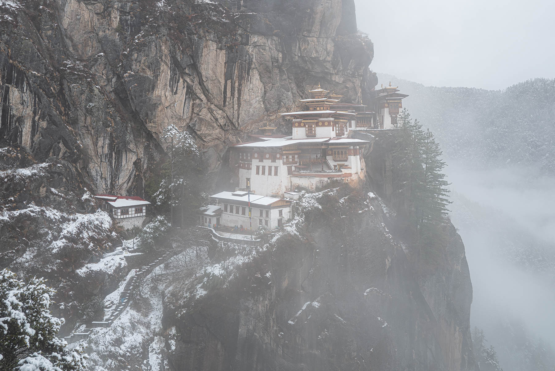 パロ郊外にあるタクツァン僧院を訪れた日は、季節外れの雪が降っていた。登山口から僧院まではおよそ2~3時間。途中には食事をとれる休憩所もある。道はよく整備されているものの、積もった雪で歩きにくい。休憩所から見上げると、僧院はガスに見え隠れしてまだまだ小さく遠くに見えていた。