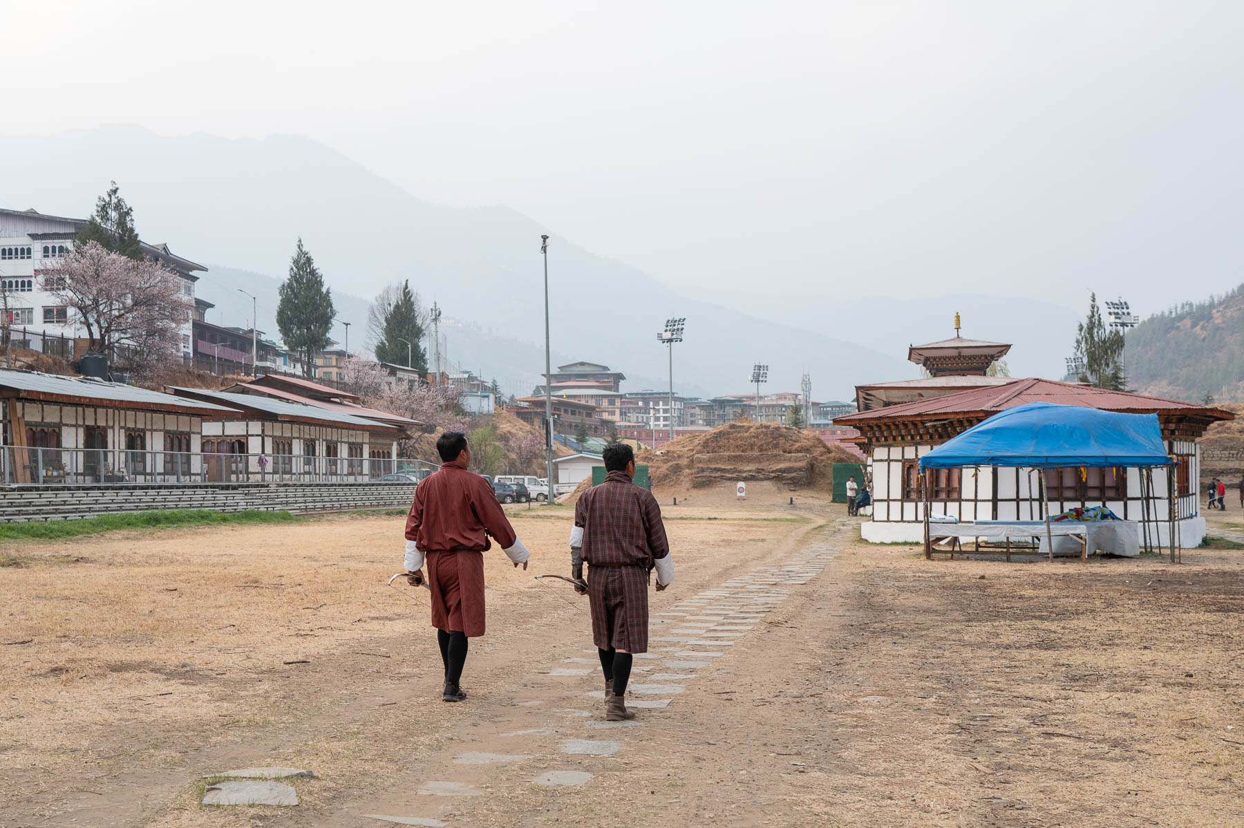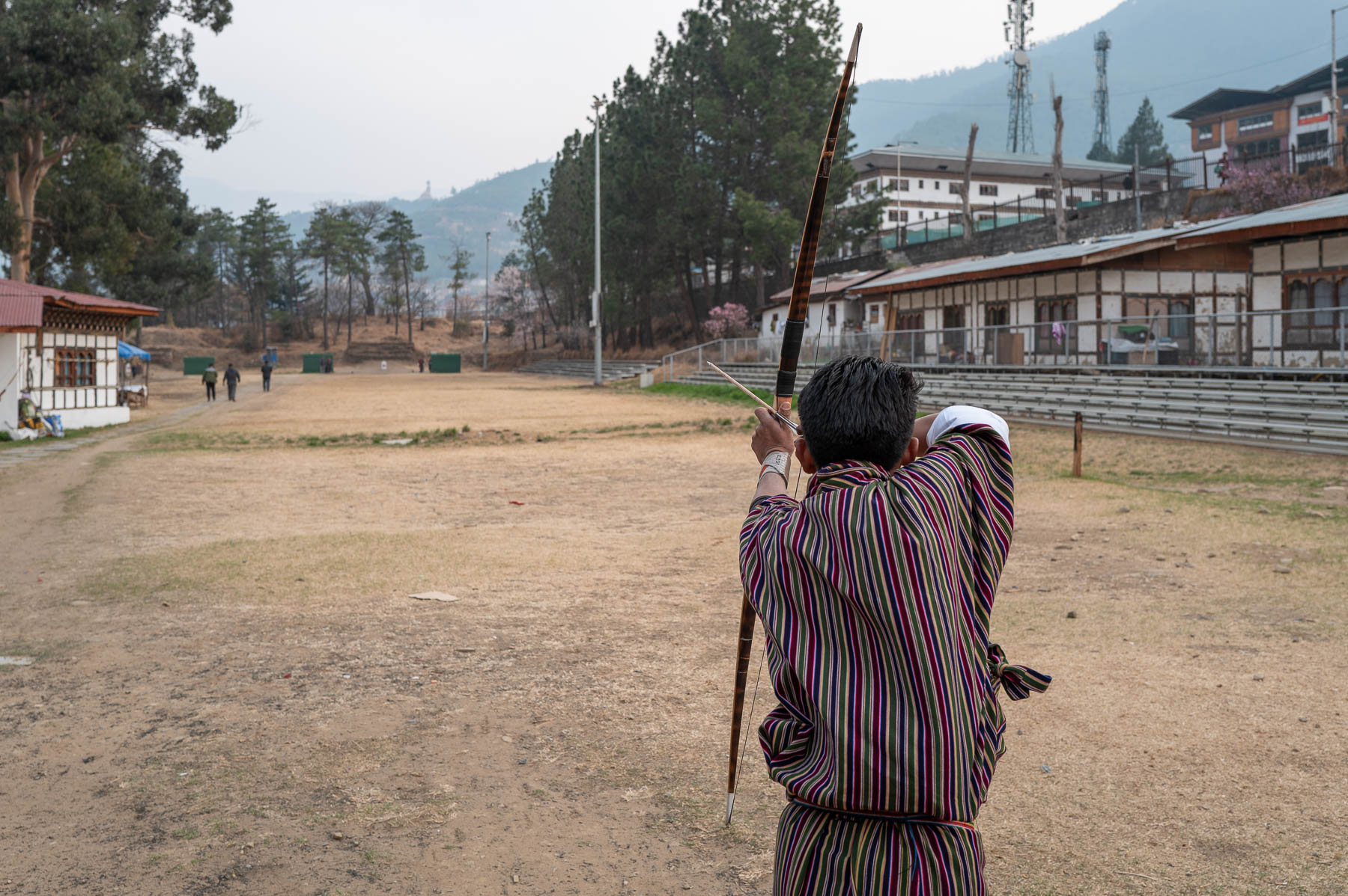 ダツェはブータンの国技として親しまれる弓競技だ。フィールドの両側には小さな的があり、その距離は長く140メートル。選手は弓を放ち、反対側の的まで歩いて確認する。相手はそこから逆向きに矢を放って、また歩いて戻る、という段取りで試合が進む。のんびりとした競技で、朝から一日かけて、場合によっては翌日まで持ち越すこともあるそうだ。
