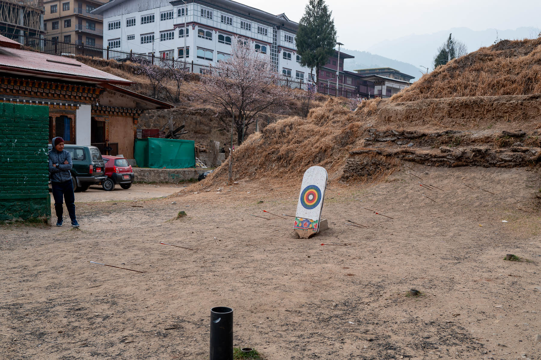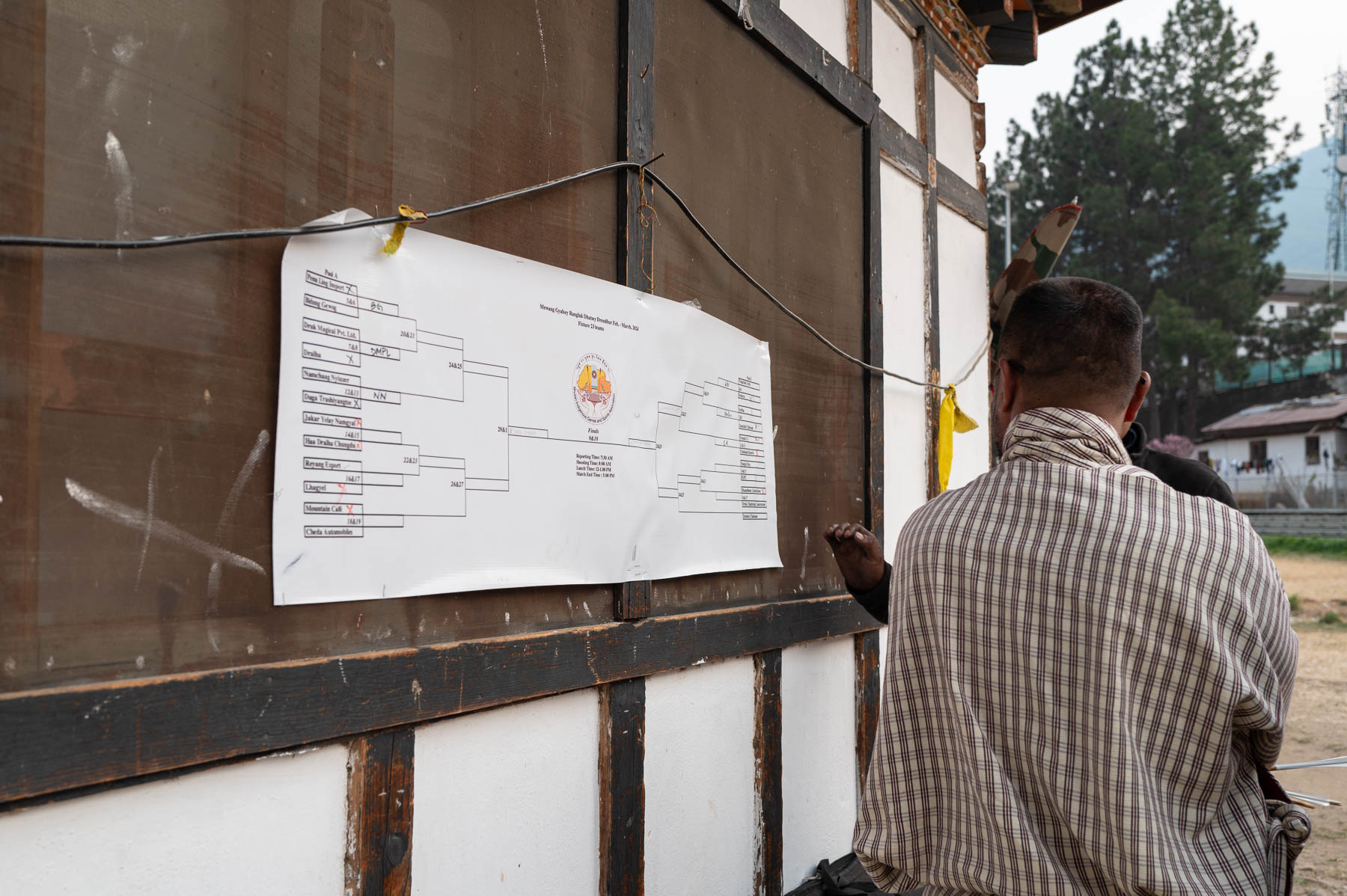 さて、宿泊していたティンプーのホテルの前に横に広いフィールドがあって、地元の人たちが集まっていた。行ってみると伝統的なアーチェリー「ダツェ」の試合をしているという。リーグ表が張り出されていた。