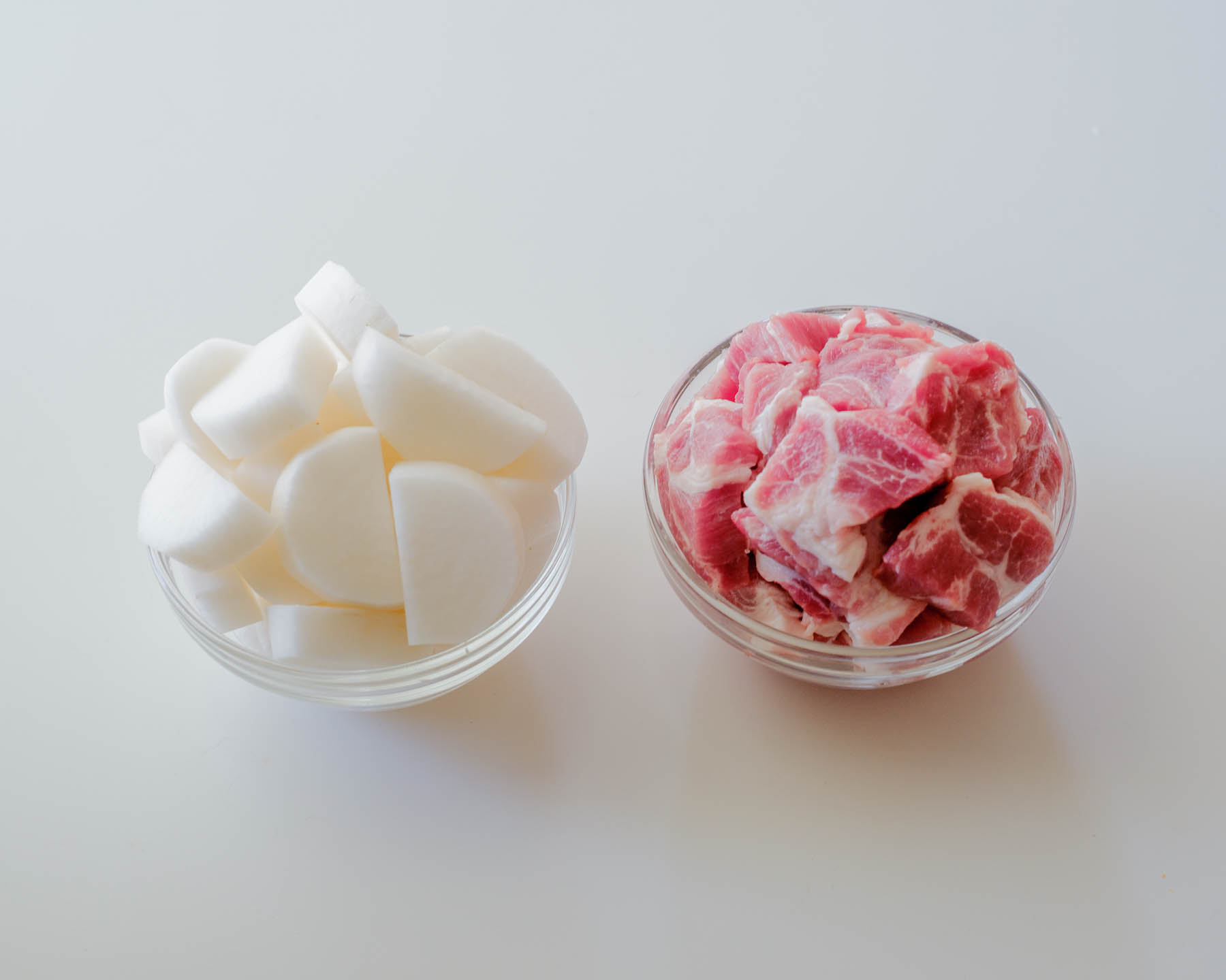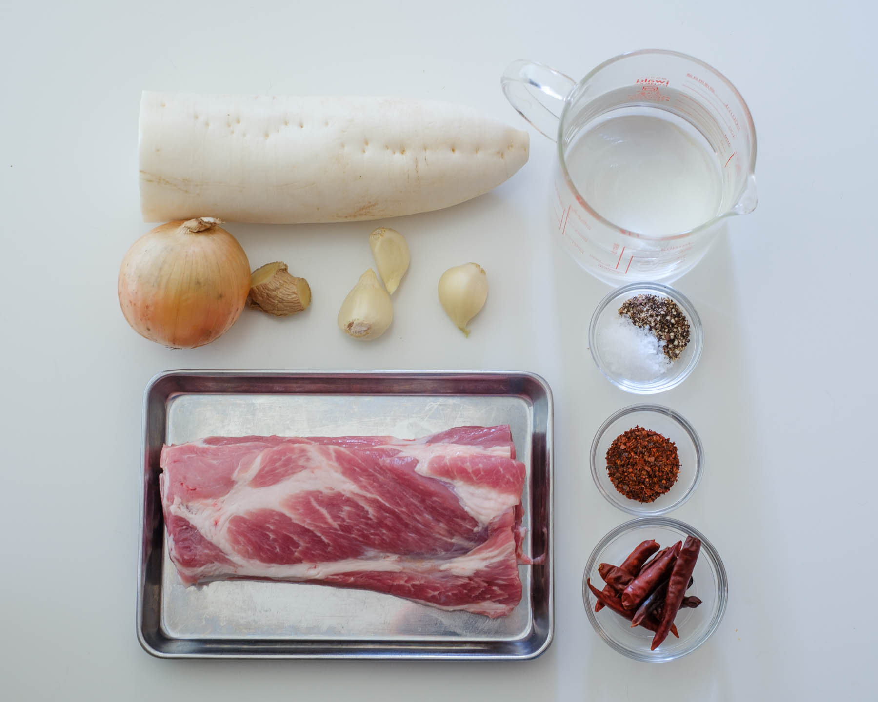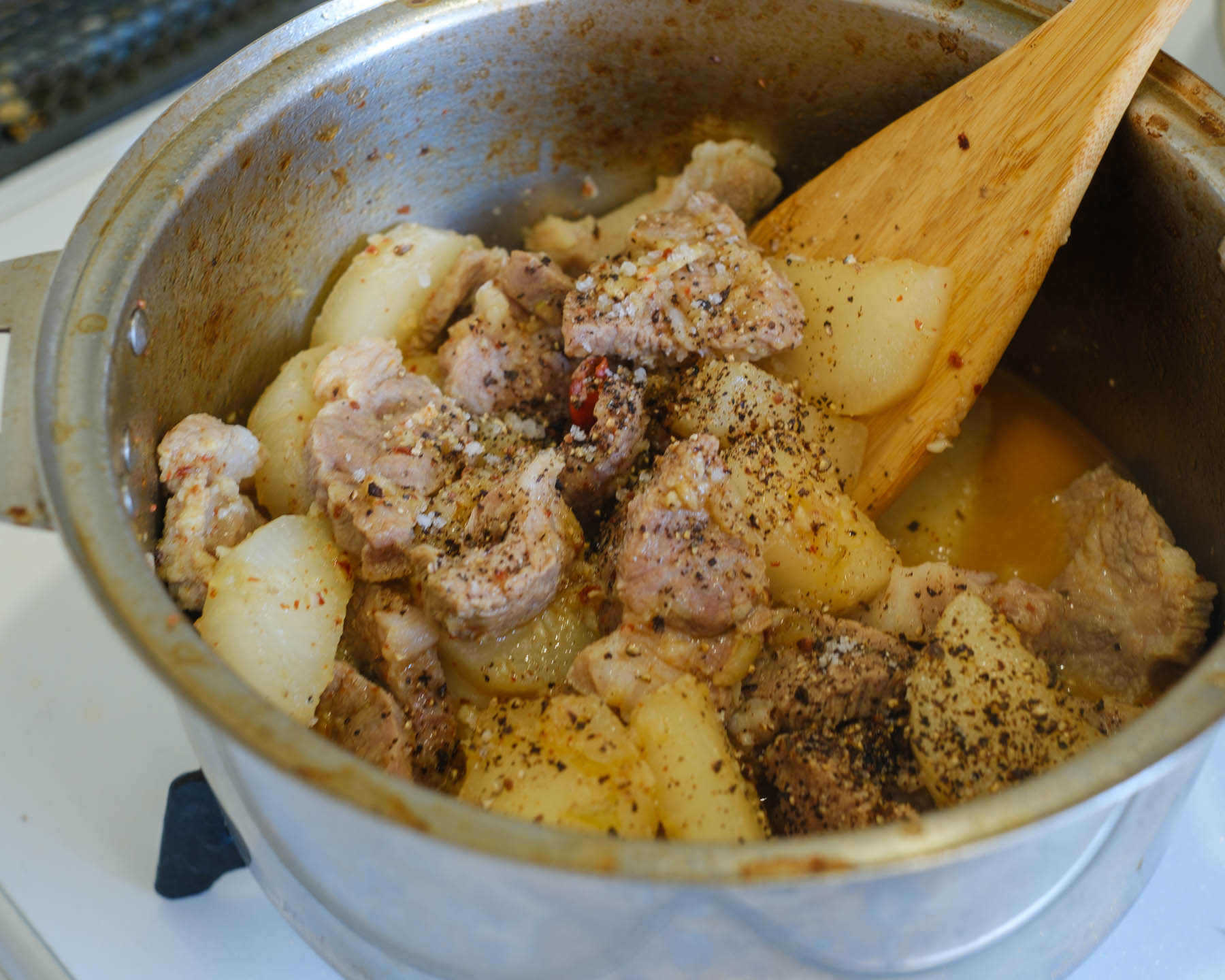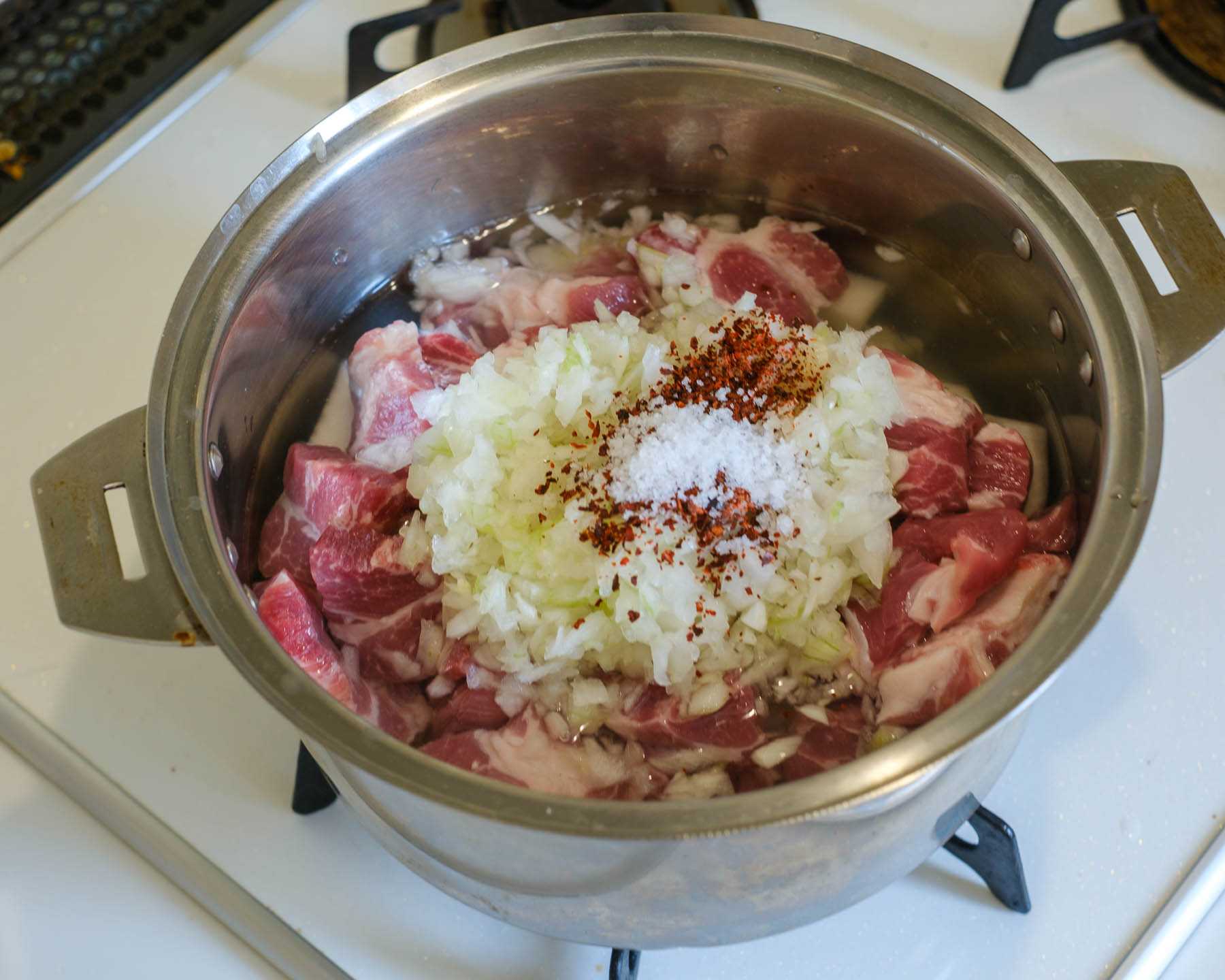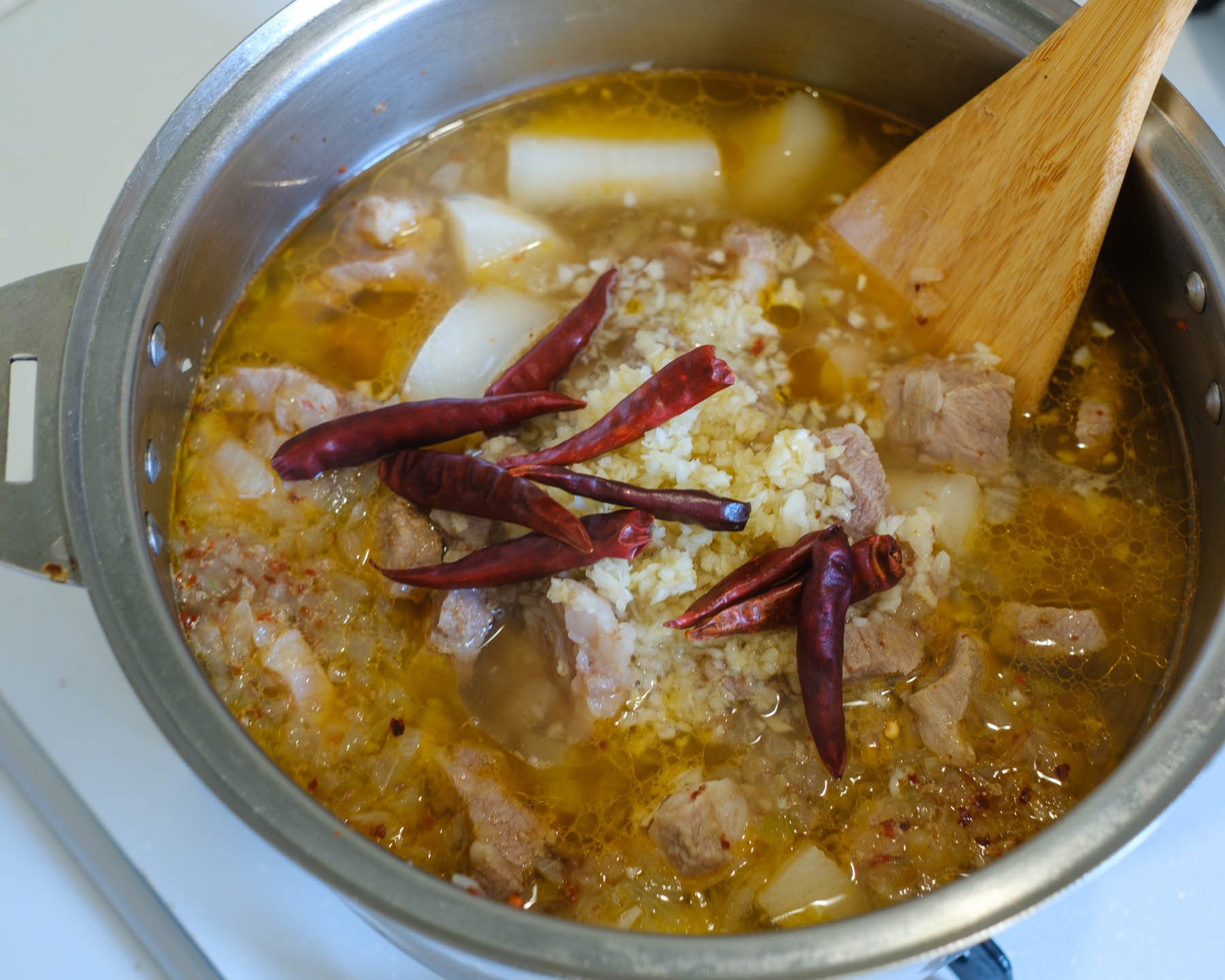 1. 豚肉、大根、玉ねぎ、チリパウダー、塩、水を具が火たる程度入れて沸騰したら、豚肉が柔らかくなるまで中火で10分ほど煮る。