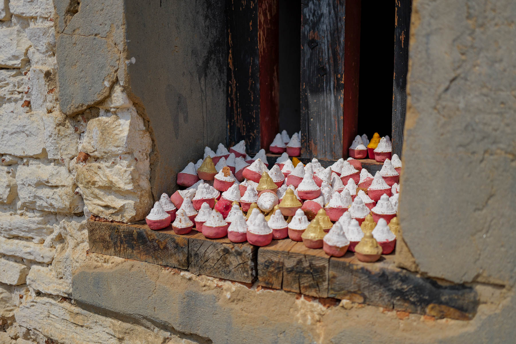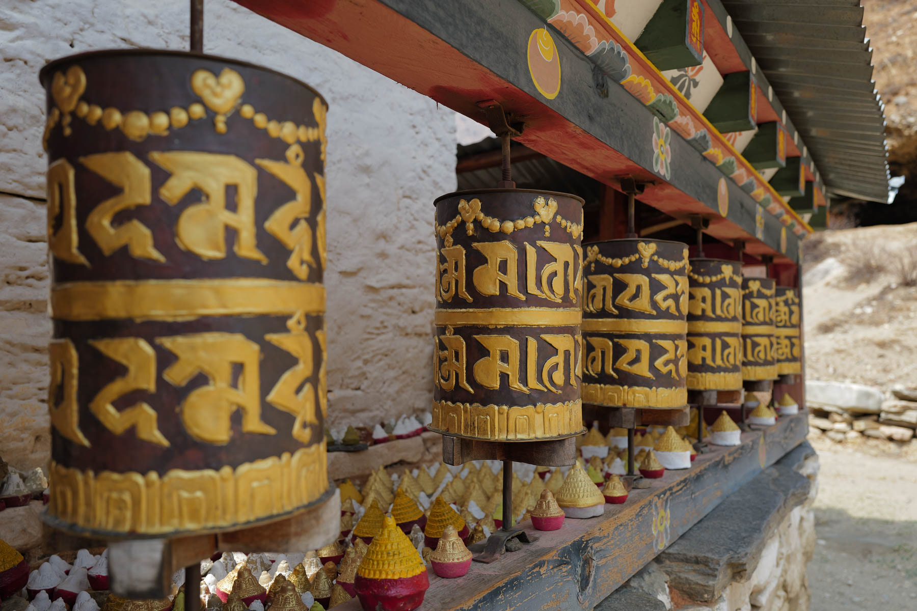 ブータンの寺院には、必ずといっていいほどマニ車がある。内部には経典が収められており、一度回すことで、その経文を一度読んだのと同じ功徳を得られるとされている。参拝者はマニ車を回しながら、時計回りに寺を巡っていく。そのそばに、小さな三角形の仏塔のようなものが並んでいた。これはツァツァと呼ばれるもので、遺骨を砕いて作られる。ブータンには墓に埋葬するという習慣はなく、遺体は火葬されればその遺灰は川に流されることが多いのだそうだ。子どもの場合には、山の鳥へと遺体を捧げる「鳥葬」が行われることもあるという。
