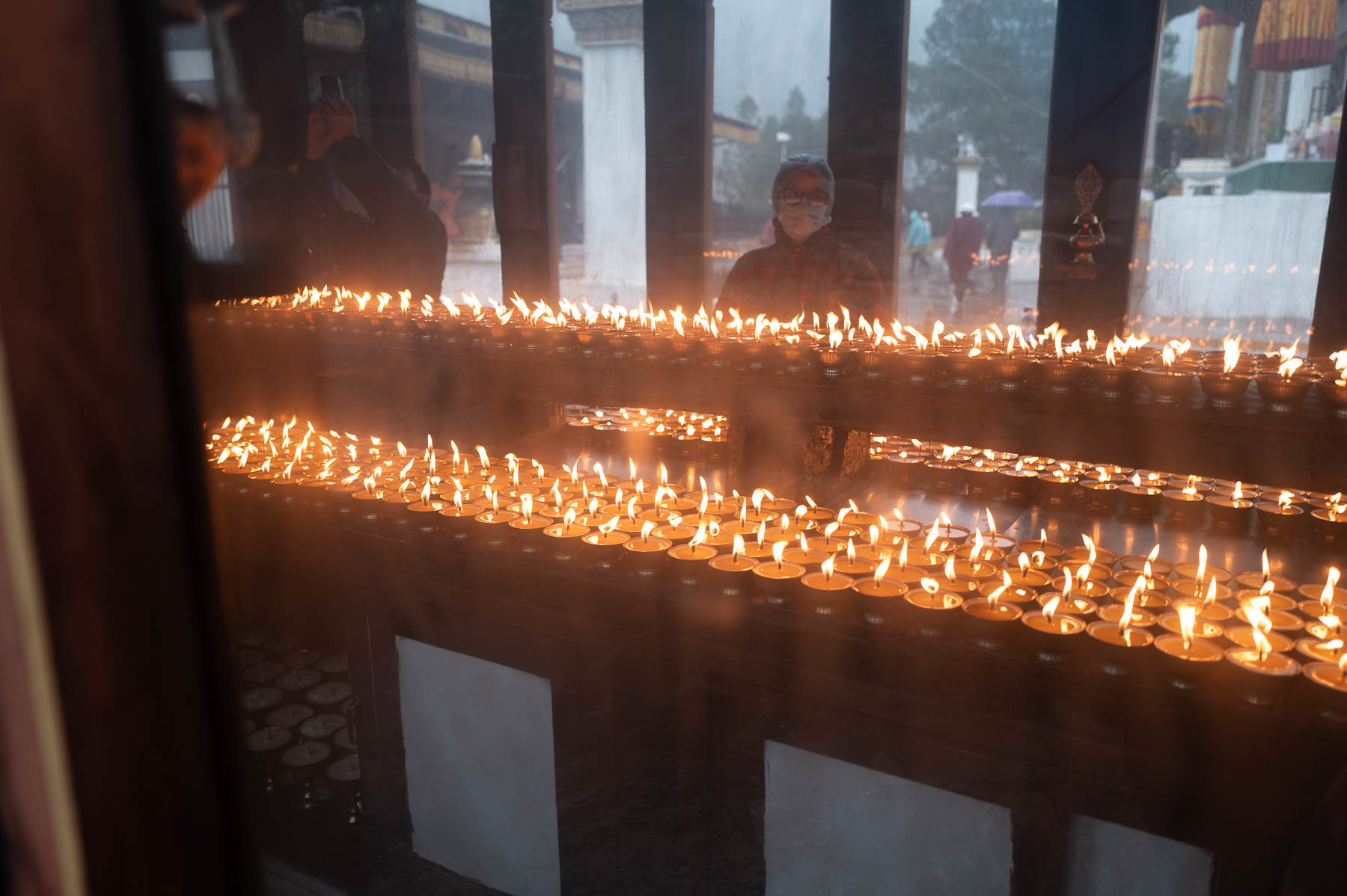 仏塔の手前には、数えきれないほどのバターランプを収めた建物がある。そのそばで香木香草が焚かれ、白い煙があたり一面に漂っていた。仏塔の裏手にある講堂からは、尼僧たちの読経の声が外にまで響いていた。講堂の内部の装飾の色彩は鮮やかで、密教を感じさせる。