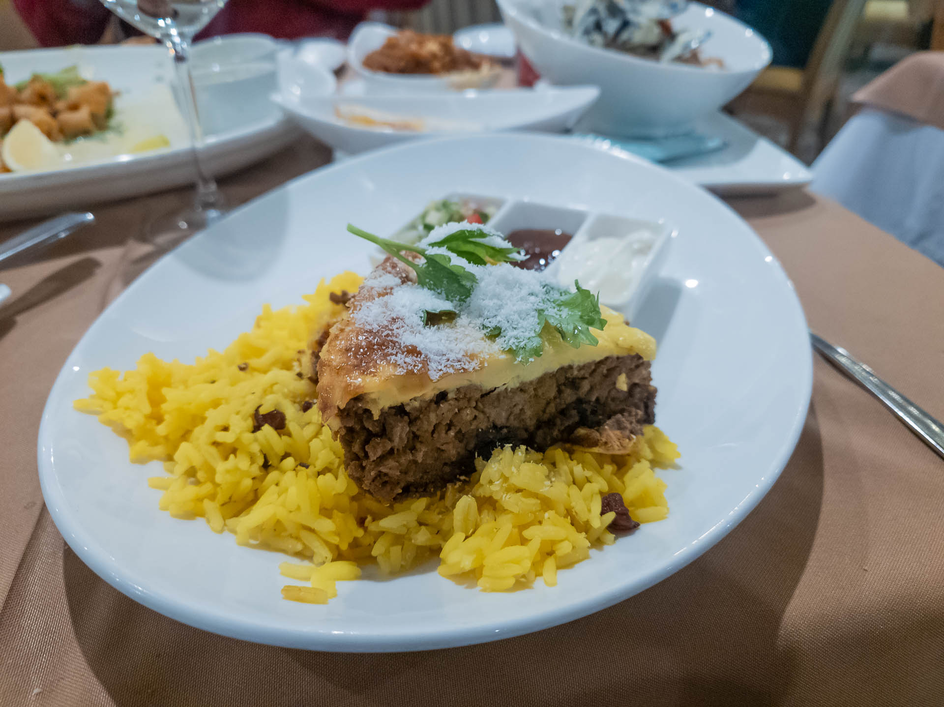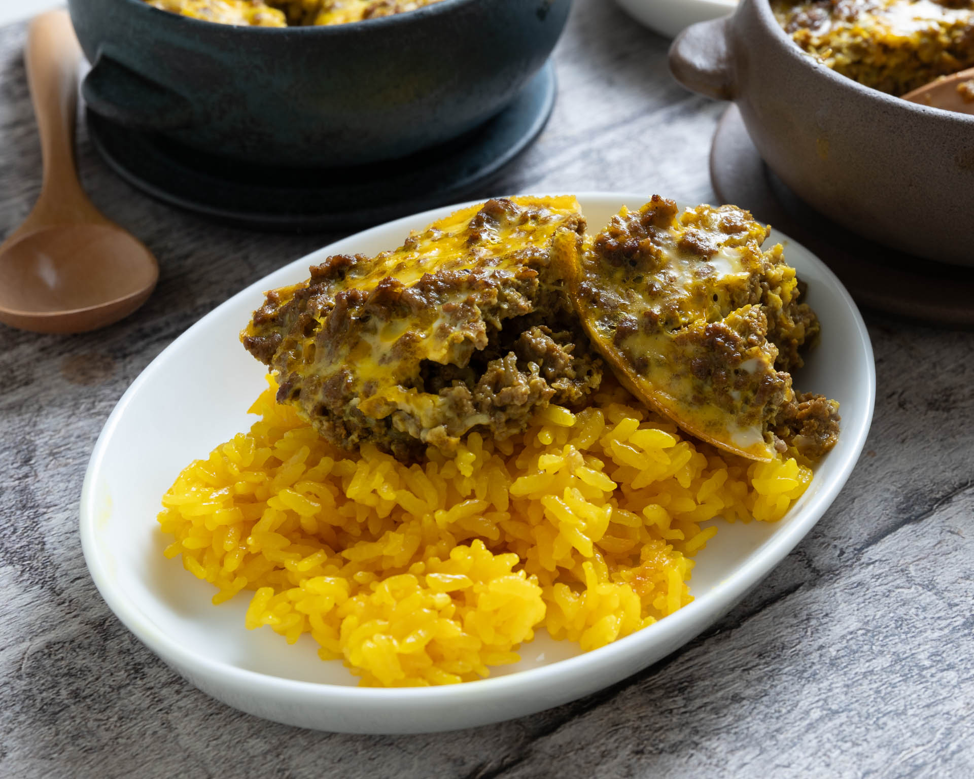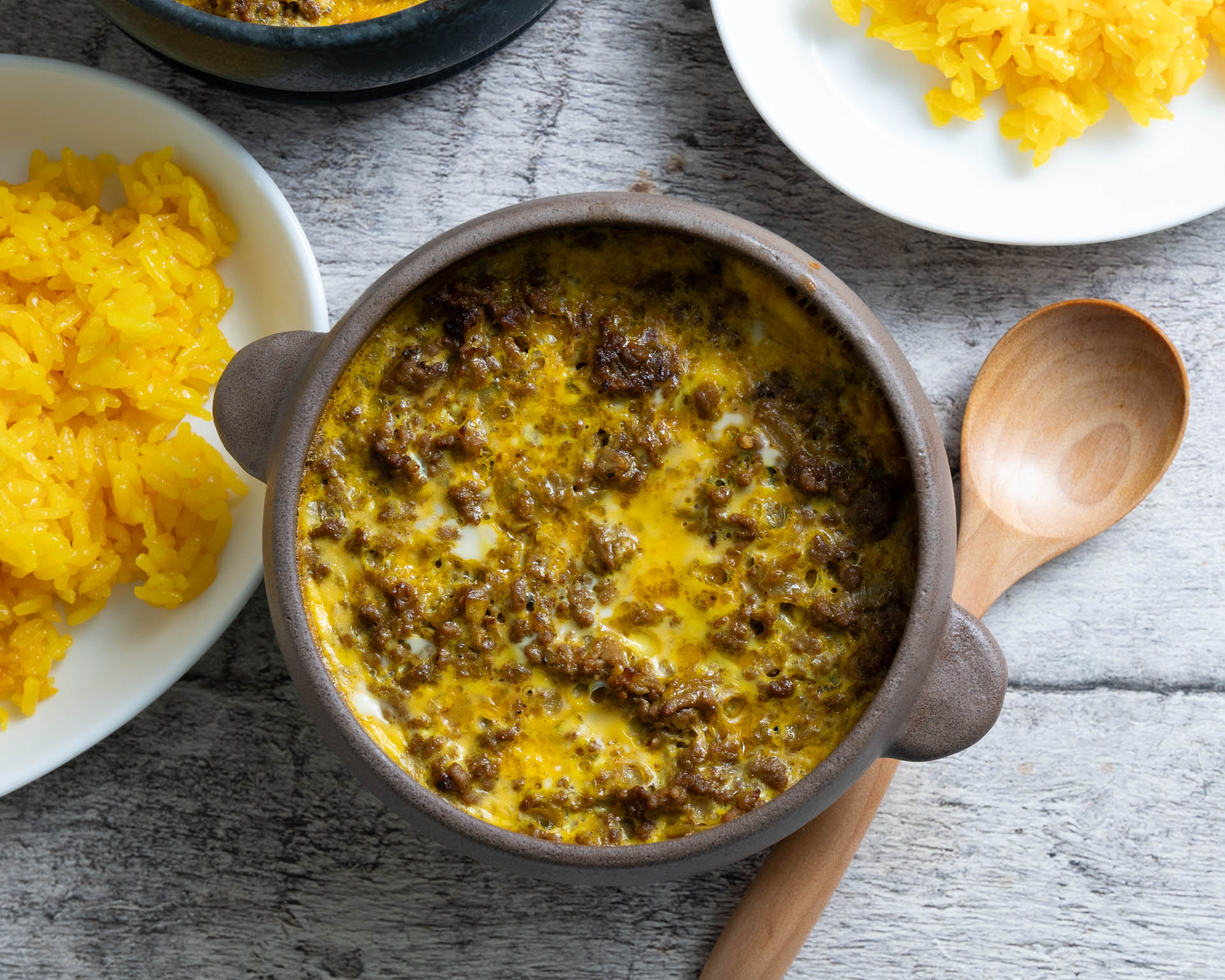 上の写真は現地のレストランで食べたもの。このように肉のレイヤーを強く固めてその上の卵のレイヤーがはっきり分かれるように仕上げることもあるが、今回は肉にたまごをからませて、ふっくらと仕上げてみた。これをターメリックライスと食べる。