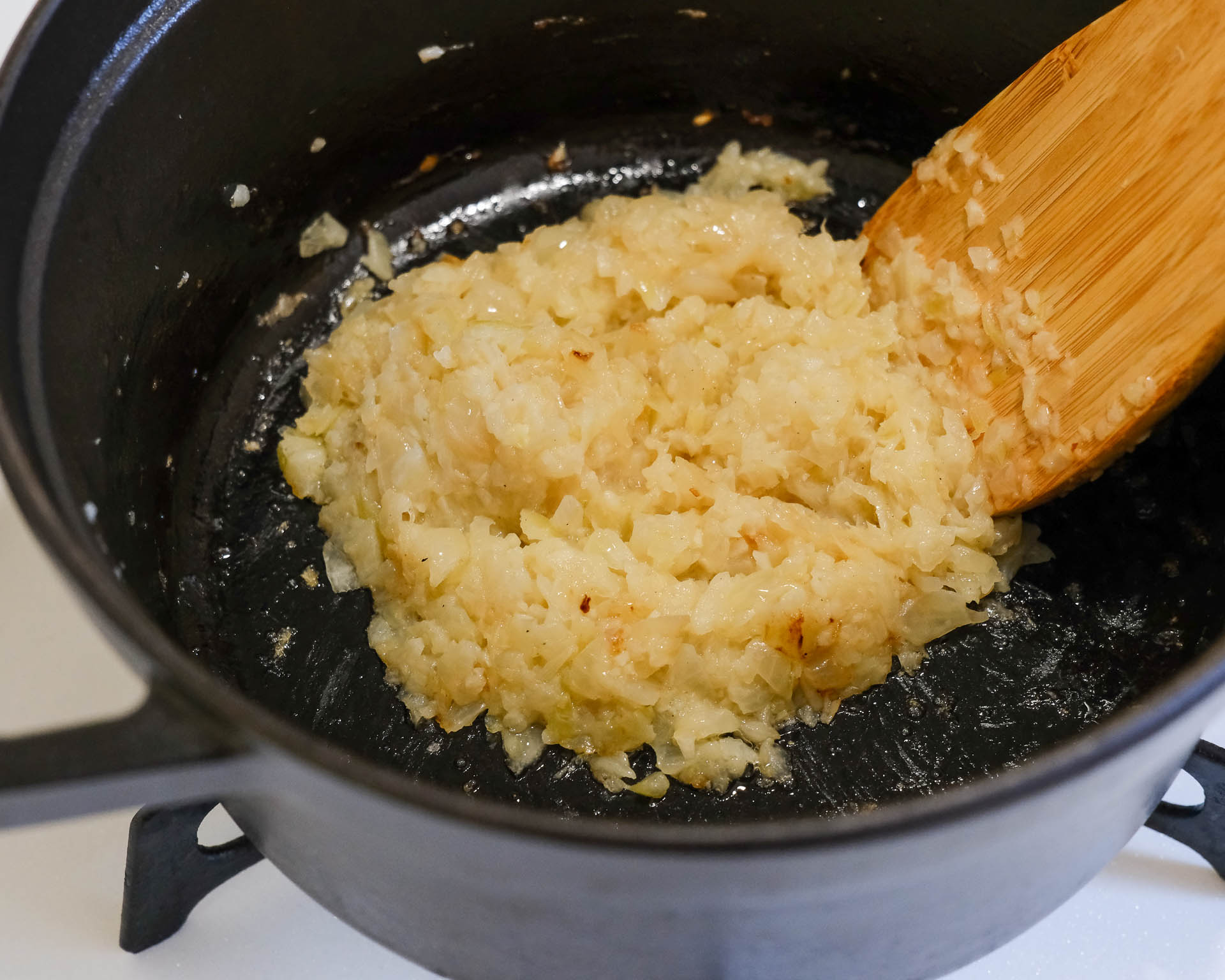 2. 厚手の鍋を中火にかけて植物油を温め、玉ねぎ、にんにくを入れて、玉ねぎがうっすらとあめ色になるまで、焦げないように炒める。