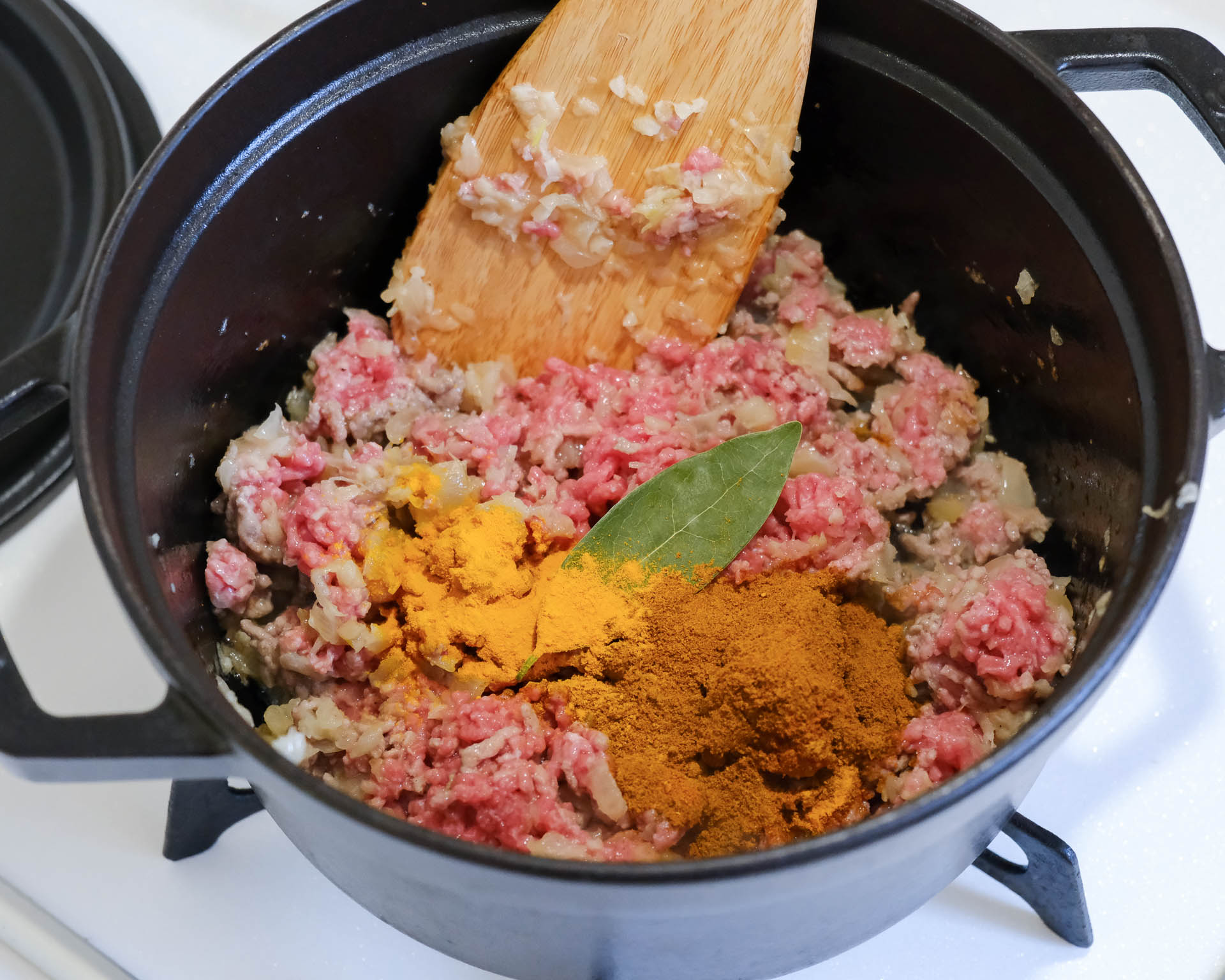3. あいびき肉、ターメリック小さじ1、カレー粉、ローリエ、塩を入れて、時々混ぜながら弱火で20分ほど炒める。水分が少なくなれば水を少量追加する。