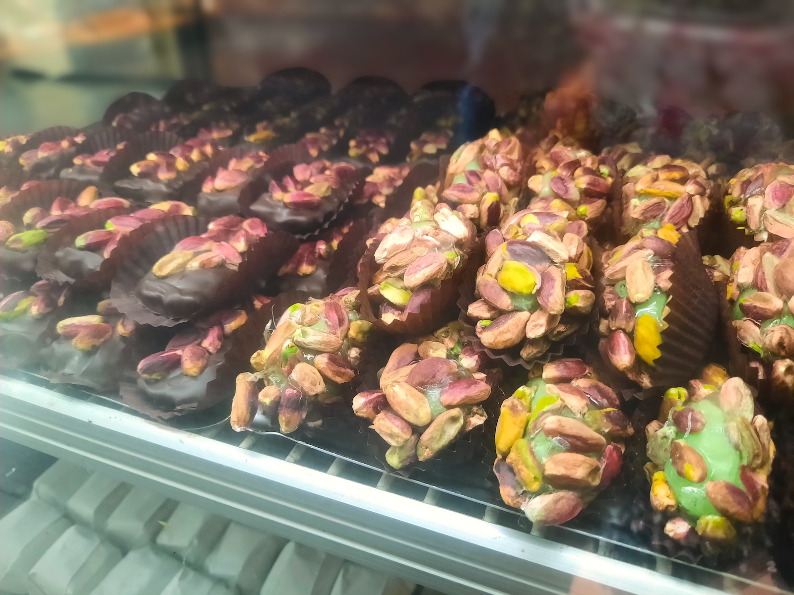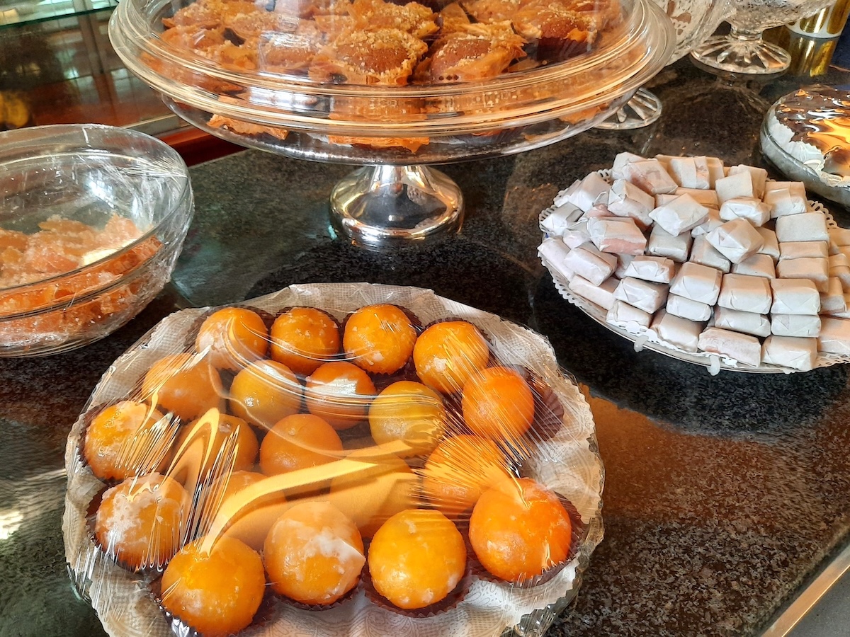 Mitropolitikonは、1930年創業の家族経営の店。歴史を感じさせる建物の前を通りかかると、思わず足を止めてしまう。持ち帰り専用の店で、商品は、建物内の工房で毎日手作りしている。砂糖でコーティングされた艶々のミカン、チョコレートなどを挟んだボリューム満点のメレンゲ、国産ピスタチオを贅沢に散りばめたお菓子、リンゴジャムを使った可愛いらしい赤系のアーモンドパイなど、この店ならではの品々もたくさんあり、若い女性観光客が来て楽しそうに選んでいた。