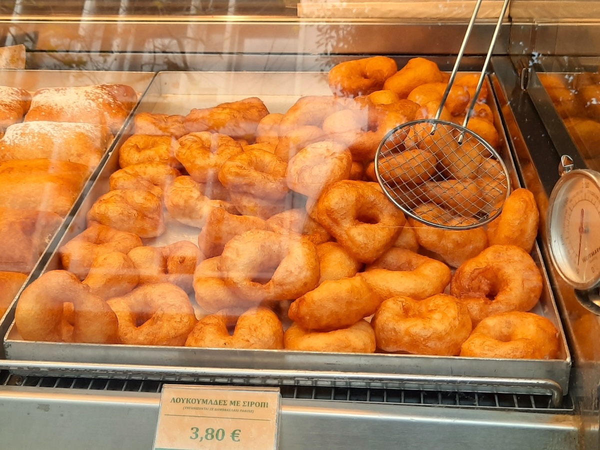 私が初めてアテネを訪れた時に行ってみたルクマデスの店は、1923年にオープンのKrinos。ルクマデスは通常はボール型だが、この店では平たく穴が開いている。広い店内で食べることもできるし、店頭でのテイクアウトもOK。