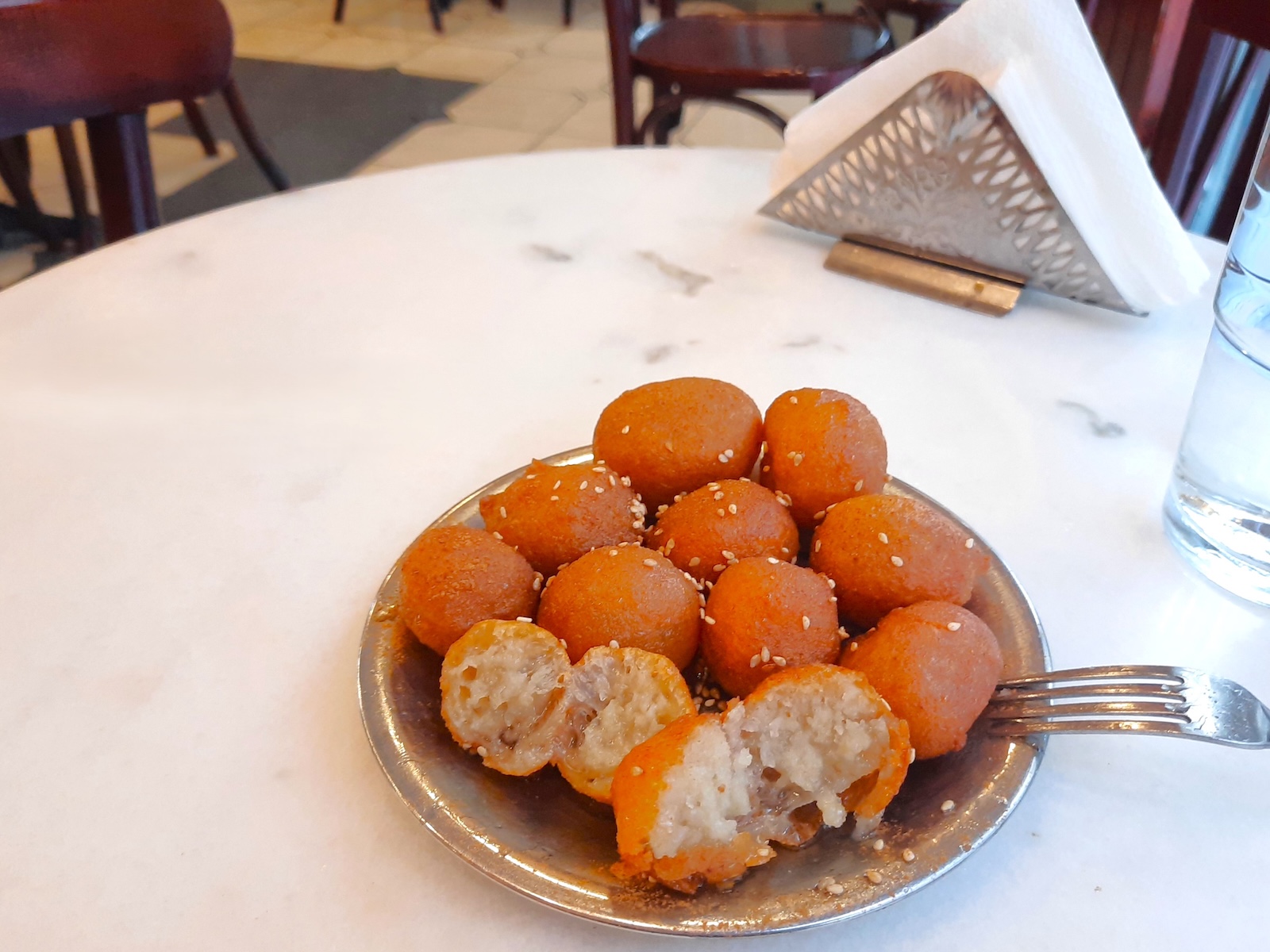 Ktistakisは少し見つけにくい場所にある。創業者の孫(現在の店主)のトドリス・クティスタキスさんが祖父のレシピを忠実に守り続けており、1人で、毎日、心を込めて作っている。Googleでのクチコミが非常に高く、「アテネでは、ここのルクマデスが最高!」という声も聞かれるので、行ってみる価値はあるだろう。クレタ島で1912年に創業し、アテネに移った。私が行った時は空いていたが、「地元の人はいつもいらっしゃいますし、観光シーズンのピーク時には観光客で賑いますよ」とクティスタキスさんは話していた。シナモンとゴマがアクセントで、外はカリッとしているのに中はシロップが浸み込んで柔らかい様子が、写真からもわかると思う。 食べ切ることができなかったので、残りは持ち帰ってホテルで食べた。