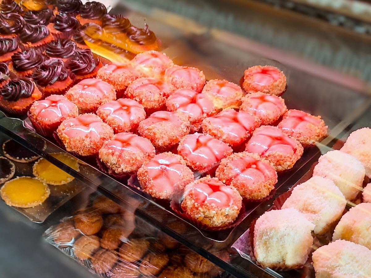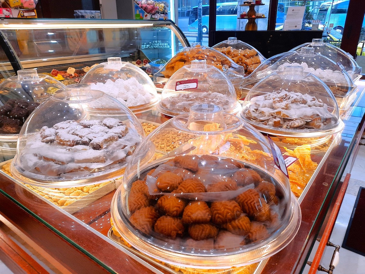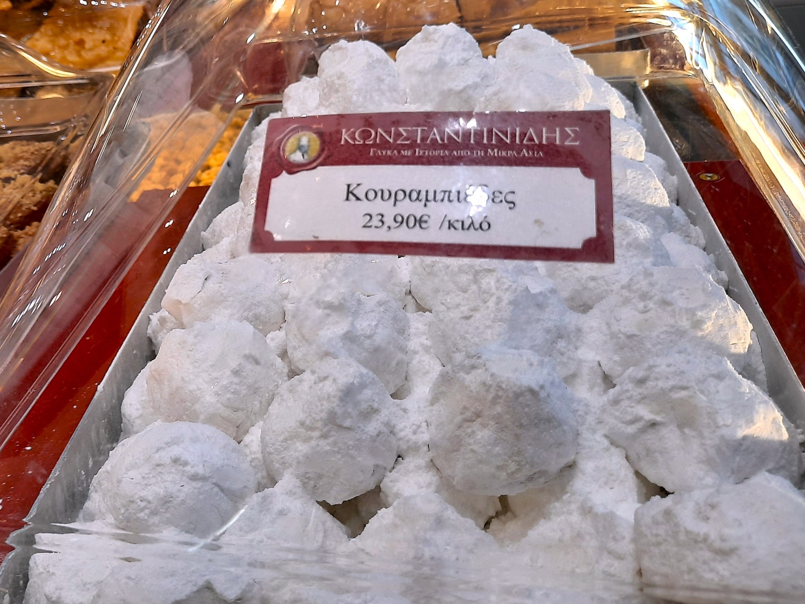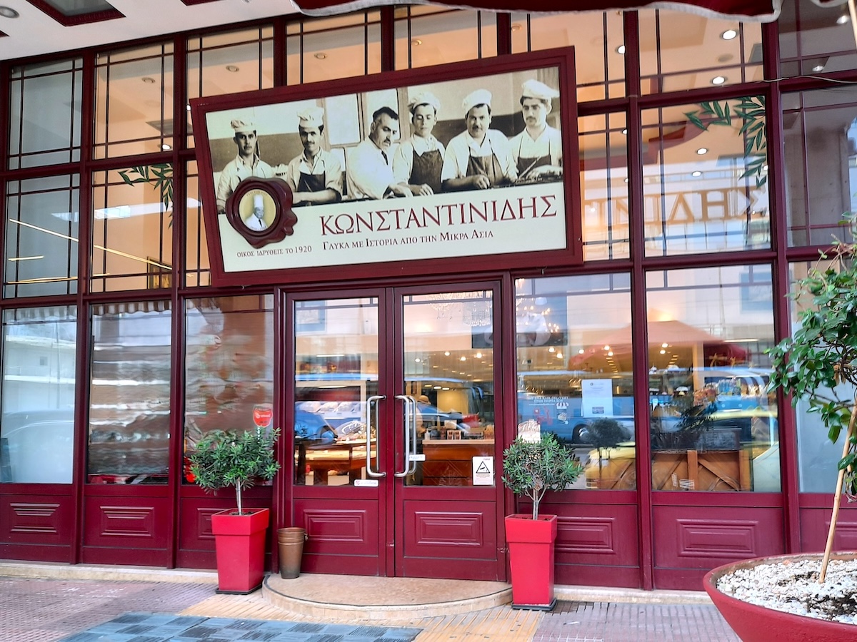 アテネに11店舗を展開するKonstantinidisも老舗だ(持ち帰りのみ)。コンスタンティニディスさんが、トルコのイスタンブールがコンスタンティノープルと呼ばれていた時代に菓子店を開き、その後、息子たちがギリシャで開業した。フランスで学んだ経験も生かし、フランス菓子も手掛けており、中でもミルフィーユ(独自のレシピ)が有名。深紅の外観が、この店の目印だ。私が訪れた店舗では、ガラス天板のテーブルの中にたくさんのお菓子が並べられ、眺めることができた。テーブルの上にはドーム型の透明ケースがいくつも置かれていた。