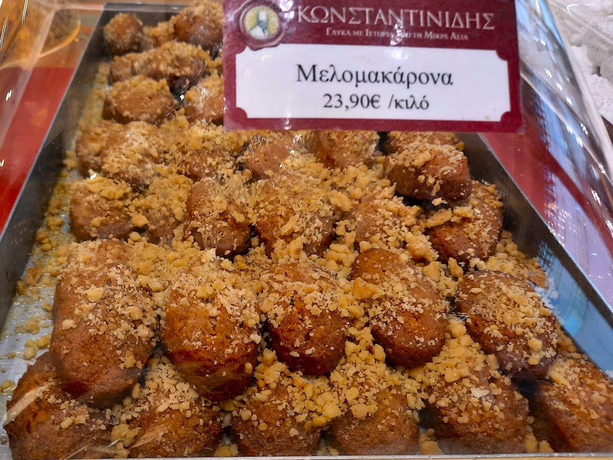 この店では、ギリシャでクリスマスの定番といわれるお菓子2種を買ってみた。『クラビエデス』は、真っ白いフワフワの粉砂糖で飾られた雪玉のようなアーモンドのクッキー(色々な形がある)。サクサク、ホロホロした食感で、2,3個食べたくなってしまうかも。『メロマカロナ』は、シナモン、ナツメグ、オレンジジュース、タイムの花から採取したハチミツ、クルミが絶妙に絡み合ったクッキーだ。