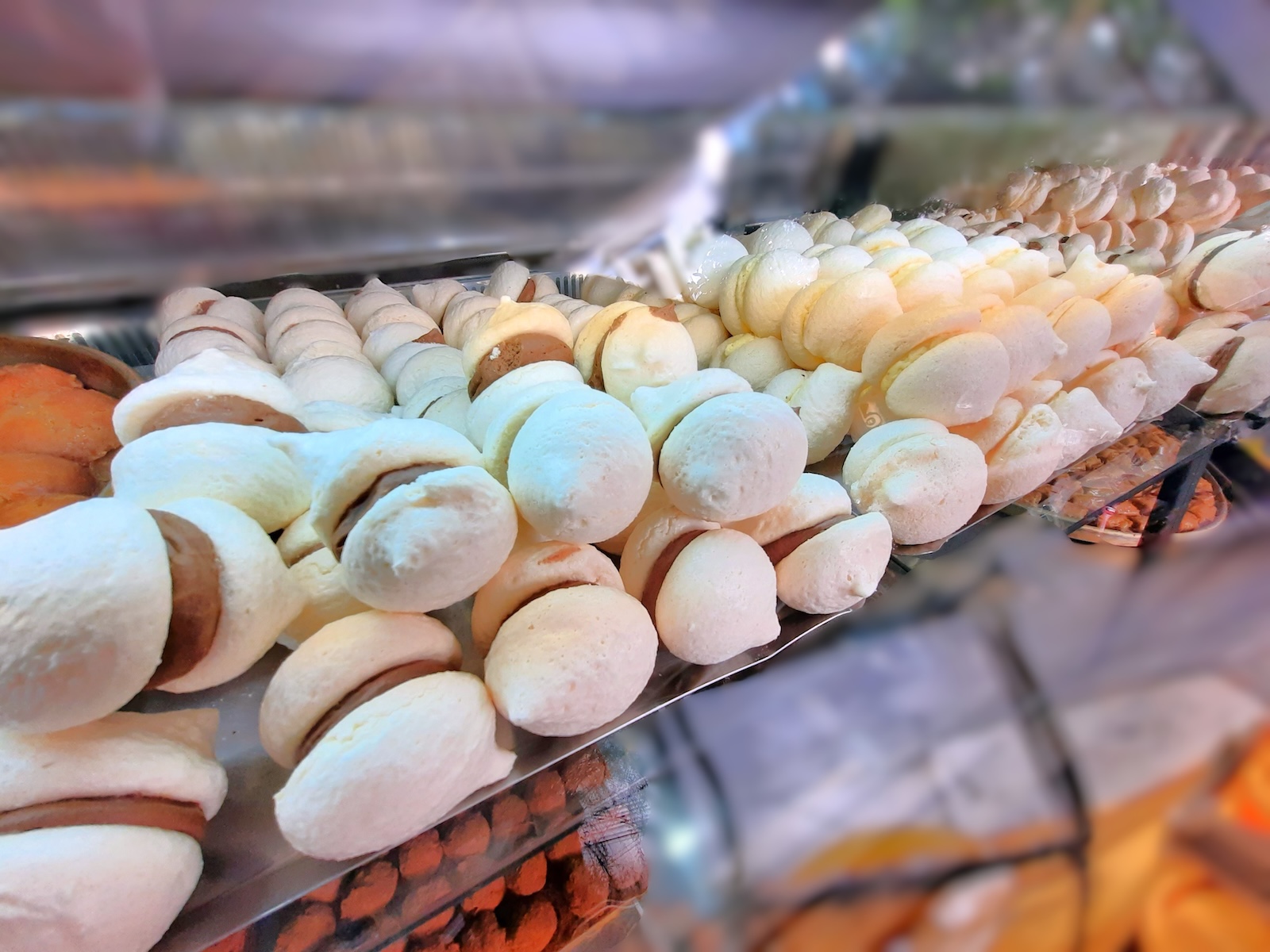 ギリシャ版マジパンとも呼ばれる、焼かないクッキー『アミグダロタ』は初めて知った。アミグダロタは、すりつぶしたりしたアーモンド、砂糖、エッセンシャルオイルなどで作られる。他のお菓子同様、バリエーションは無限で、この店では3種類のレシピで作られている。棚の一画には2種類が並んでいた。クリーム色の方はシフノス島のアミグダロタで、皮つきのアーモンドと、薬用やオイルの原料となるビターアーモンドを混ぜ、ハチミツとオレンジブロッサムウォーターで風味付けしている。一方、洋ナシ型はイドラ島発。ローズウォーターを使用し、粉砂糖をまぶし、甘くスパイシーな香りのクローブをトッピングしている。
