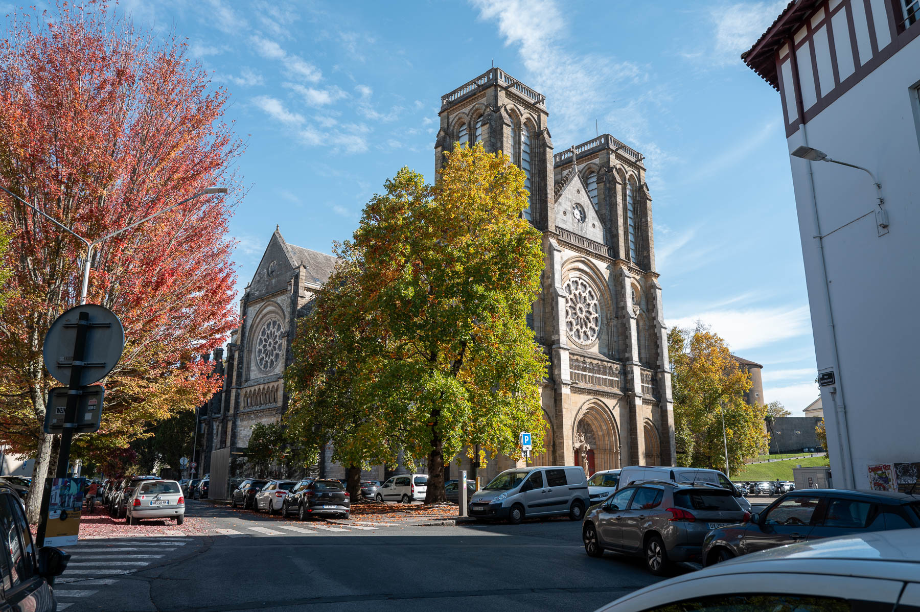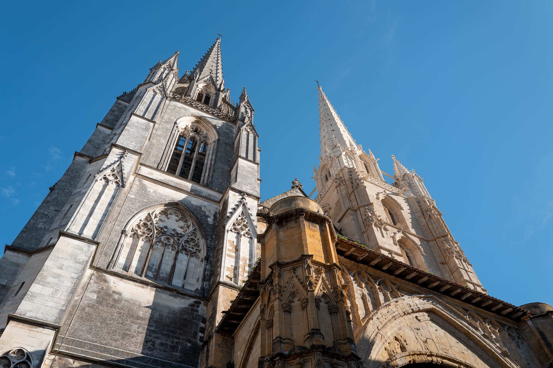 グラン・バイヨンヌには、二つの尖塔が印象的なサント・マリー大聖堂が街を見守るように建っている。エルサレム、ローマと並ぶキリスト教三大聖地の一つ、スペインのサンティアゴ・デ・コンポステーラ大聖堂を目指す世界遺産の巡礼路群『サンティアゴ・デ・コンポステーラの巡礼路』の、フランス側の巡礼路に含まれる教会で、中期ゴシック系の教会だ。13世紀に建築が始まり、一部を除いて17世紀に完成した。聖堂の中の赤い壁と天井の深い緑色が印象的で美しい。1998年に世界遺産に登録されている。
