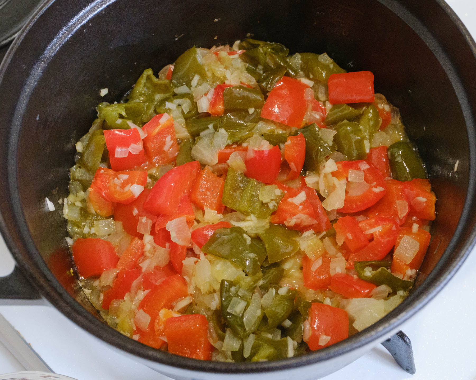 1. 厚手の鍋を中火にかけて、オリーブオイルを入れて温めたら、ピーマン、パプリカ、玉ねぎ、塩少々を入れて蓋をし、時々混ぜながら20分炒め煮にする。