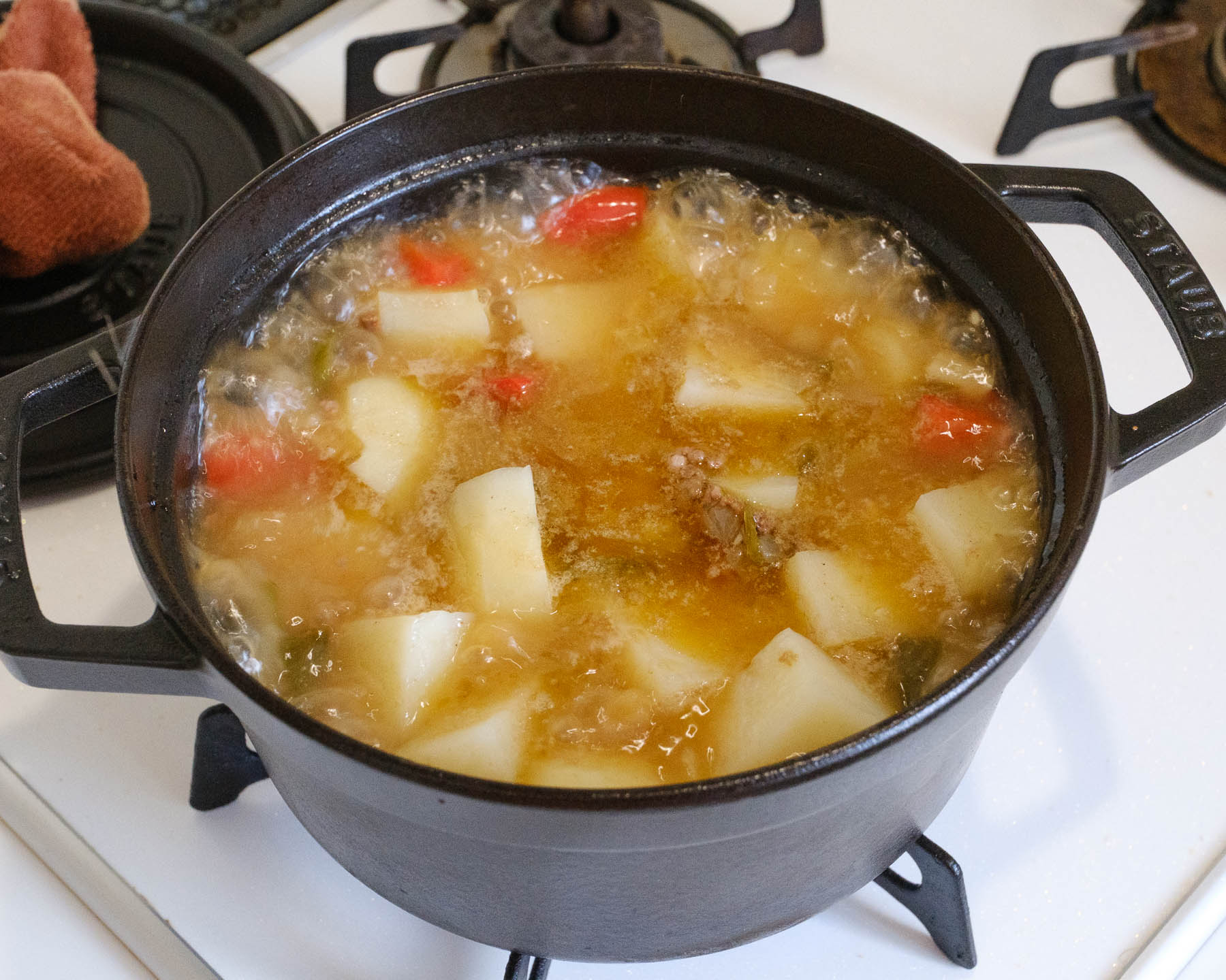 4. 1の野菜を加えてビーフコンソメスープを入れて中火にし、沸騰したらじゃがいもを上に乗せて、じゃがいもが柔らかくなるまで蓋をして煮込む。