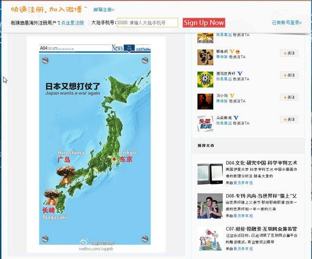中国・重慶共産主義青年団の週刊紙『重慶青年報』(7月3日版)に、広島と長崎の位置に「きのこ雲」と炎のイラストを描いた日本地図が掲載された。「日本は再び戦争を欲している」という見出しの全面広告で、強硬な論評とともに掲載された。