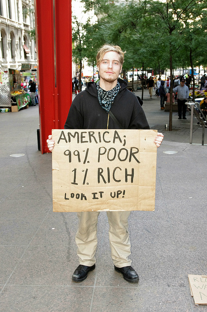 貧富の差は世界的問題である。貧困問題の解決を目標とするNGO「オックスファム」が19日発表したレポートによると、2014年、世界の上位1%の最富裕層が、世界全体の富の48%を所有していた。最富裕層のうち、上位80人の大富豪が所有する富の合計は1.9兆ドル(約223 兆円)に上り、これは世界の下位50%、35億人が所有する富にほぼ等しいという。