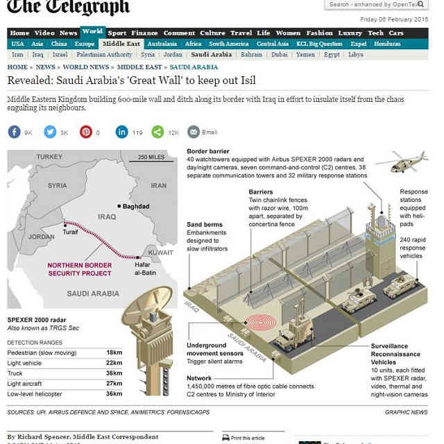 サウジはISILの侵入を防ぐべく、イラクとの国境1000kmにわたって、「万里の長城」ともいうべきフェンスを設置している。イラク内戦時の2006年から検討されており、昨年9月から建設が始まったという。1月15日付の英テレグラフ紙が報じた。