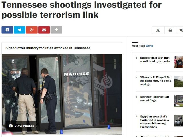 アメリカ・テネシー州の2ヶ所の軍施設が16日、1人の男に銃撃され、海兵隊員4人が死亡、警官と海軍の兵士ら3人が負傷した。男は銃撃戦の末に死亡した。捜査当局は容疑者の身元を、米国籍でクゥエート出身のムハマド・ユセフ・アブドゥルアジズ(24)と特定した。同容疑者と「イスラム国」などイスラム過激派グループとのつながりの有無は判明していないが、テロの可能性も視野に入れて捜査が行われている。