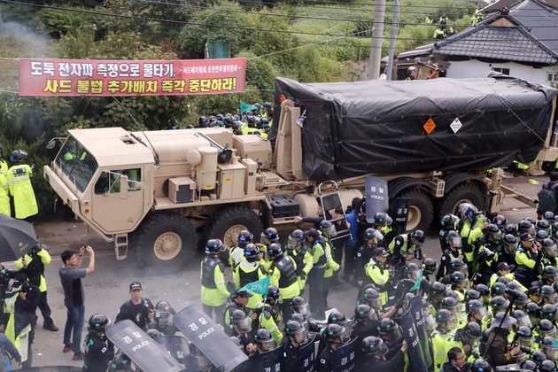 【ソウル市・AP通信】 北朝鮮の脅威に対応するため最新鋭防衛ミサイルシステムが配備されている韓国南部の町に、9月7日、米軍がその発射台を追加配備した。同日、それに抗議をおこなった韓国の活動家と警察との間に衝突が起こり、数十名の負傷者が出た。